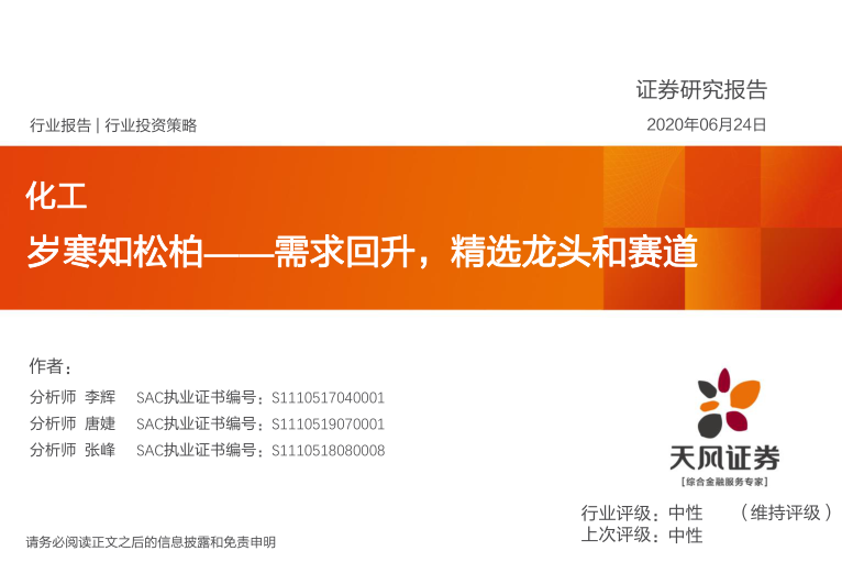 本报告核心观点指出,2020年一季度化工行业受国内外疫情冲击和原油价格大跌影响,景气度整体下行,营收和利润大幅下滑,多数产品价格和价差处于历史低位。然而,随着疫情缓解和需求逐步复苏,行业有望迎来反转。