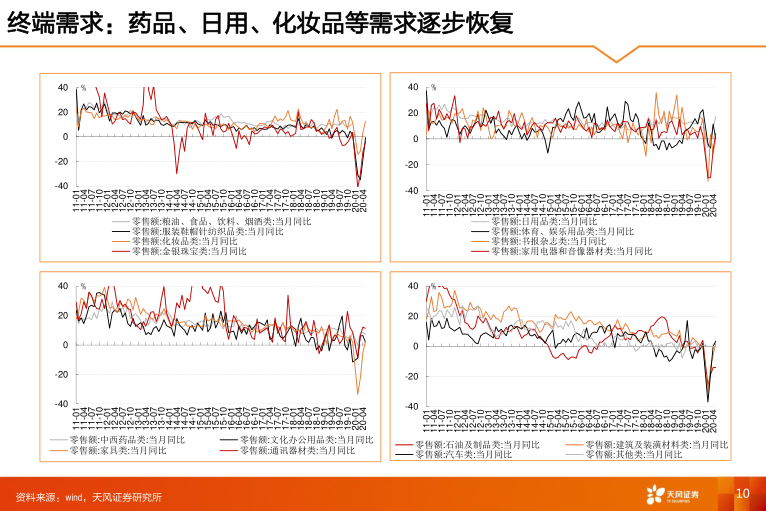 - 消费品: 药品、日用、化妆品等零售额同比增速逐步恢复。食品饮料增速稳定,疫情后迅速恢复。