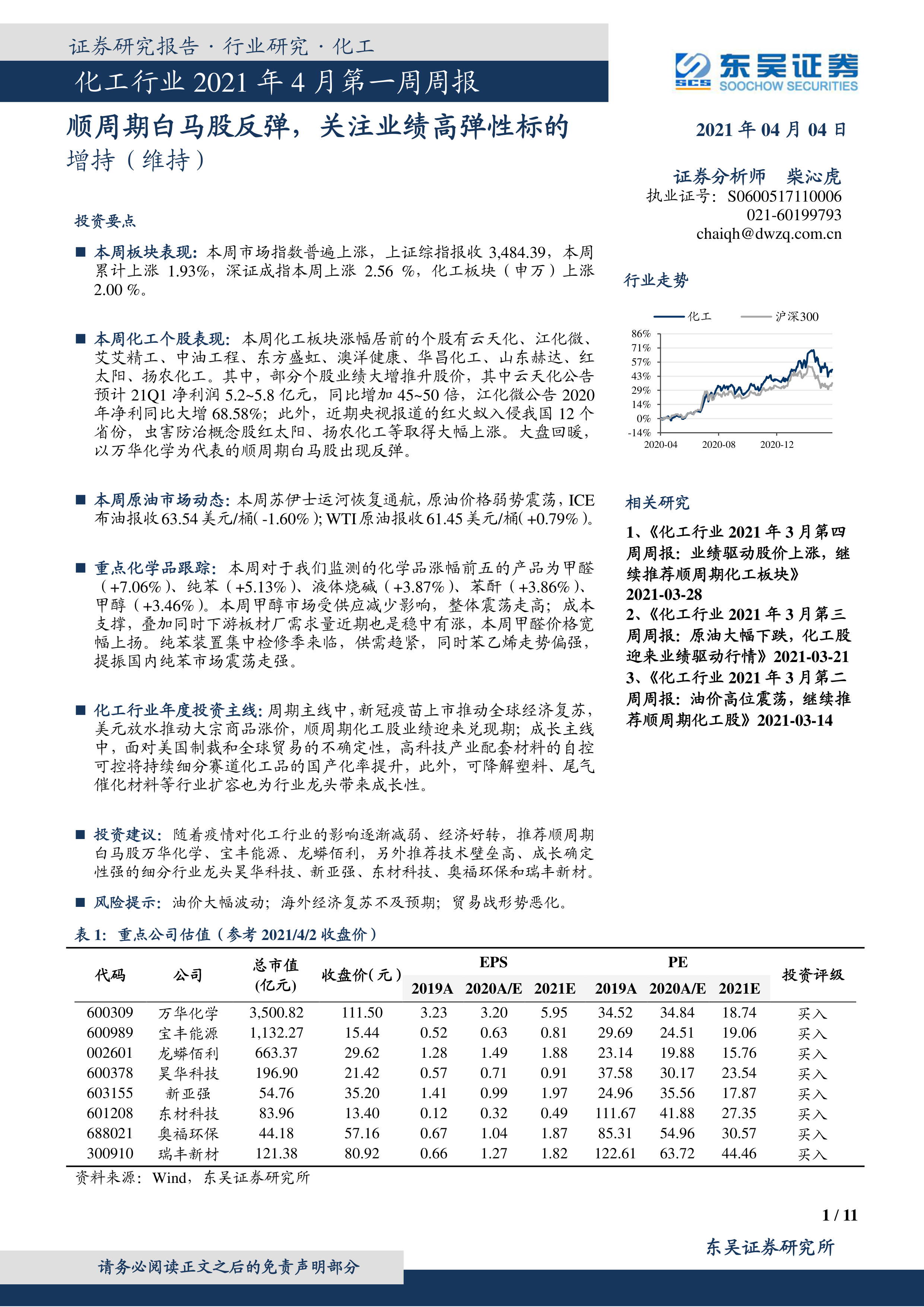 化工行业2021年4月第一周周报:顺周期白马股反弹,关注业绩高弹性标的