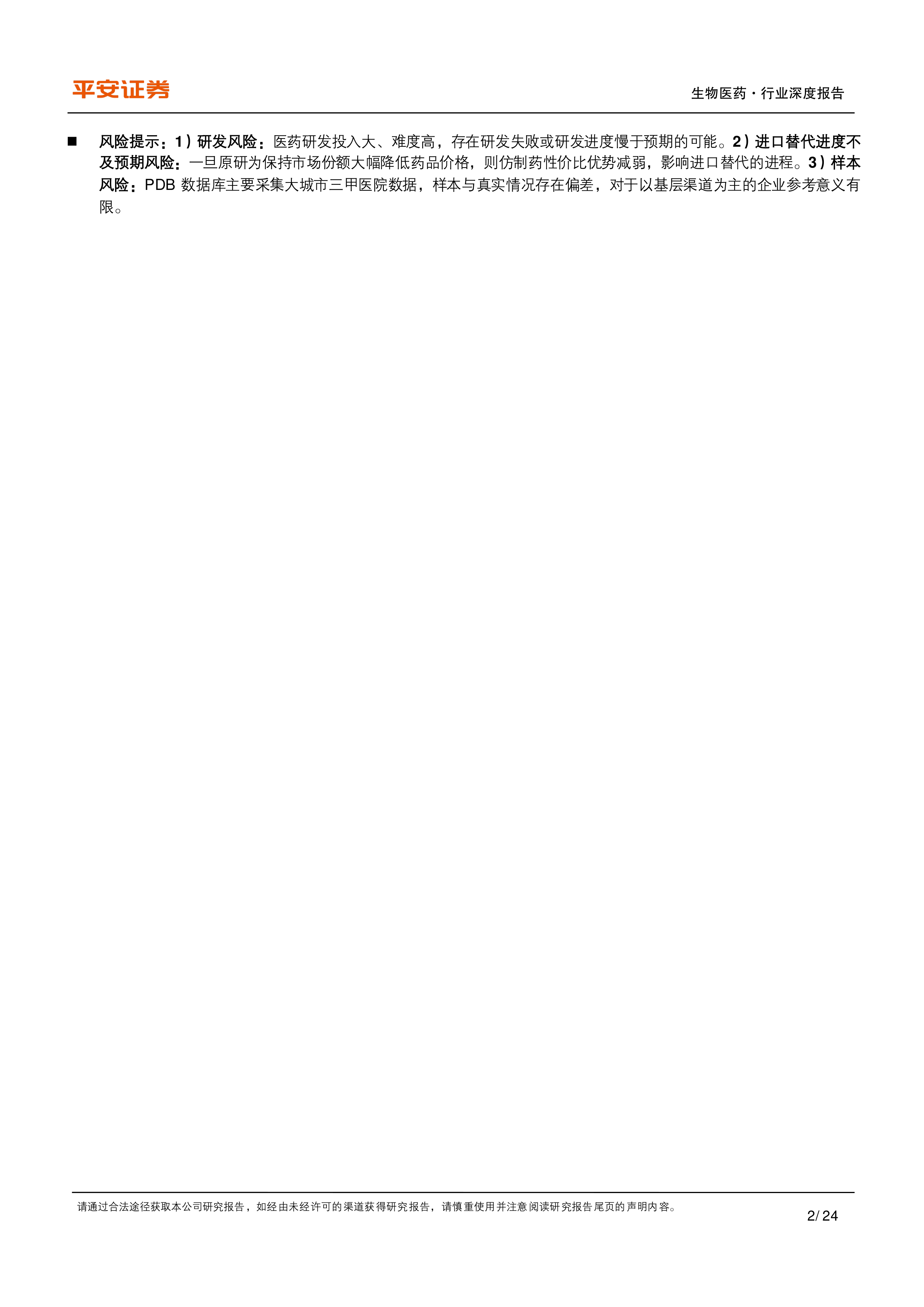 风险提示:1)研发风险:医药研发投入大、难度高,存在研发失败或研发进度慢于预期的可能。2)进口替代进度不及预期风险:一旦原研为保持市场份额大幅降低药品价格,则仿制药性价比优势减弱,影响进口替代的进程。3)样本风险:PDB数据库主要采集大城市三甲医院数据,样本与真实情况存在偏差,对于以基层渠道为主的企业参考意义有限。