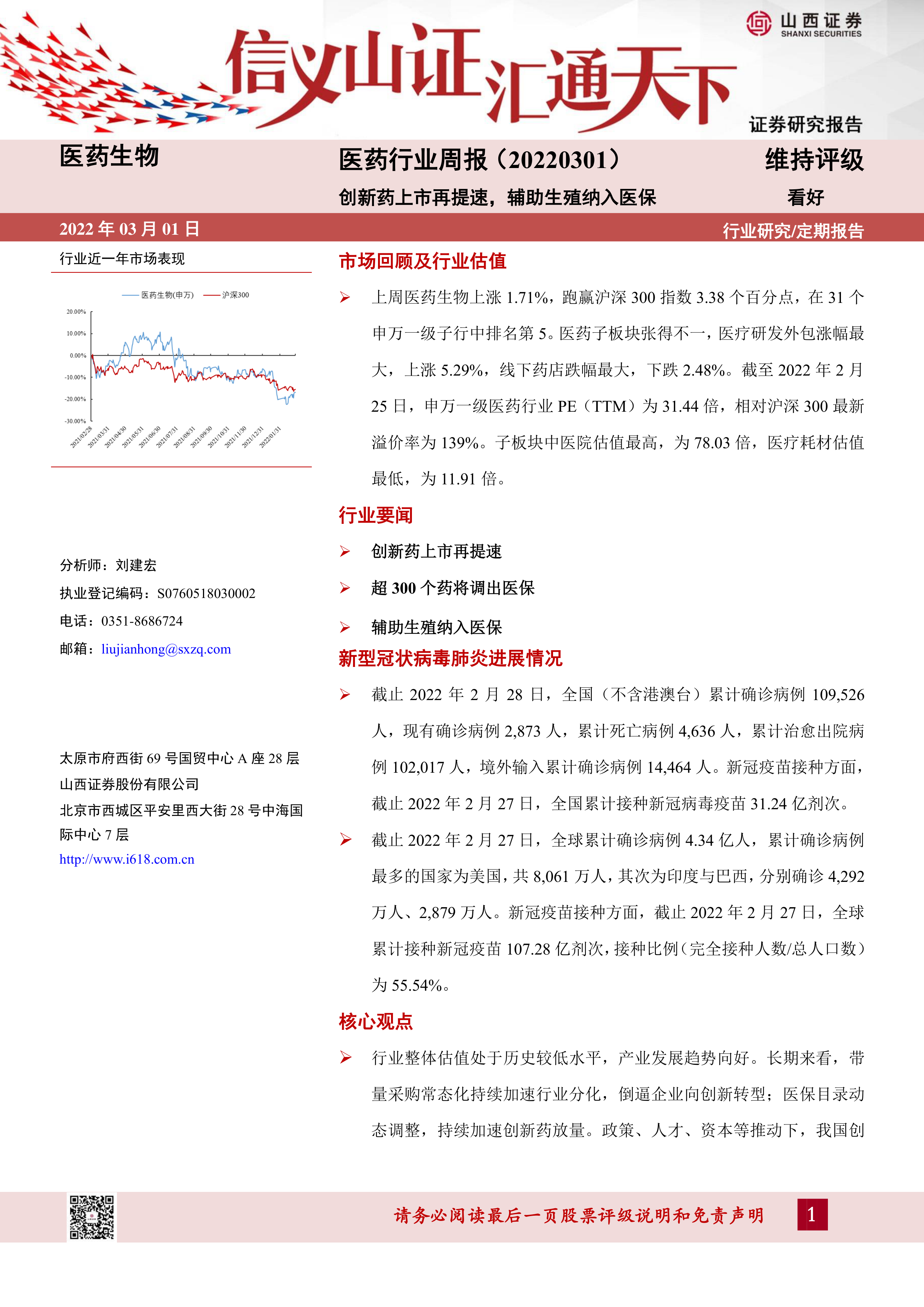 本周医药生物行业表现强劲,跑赢大盘,但子板块表现分化。行业整体估值处于历史较低水平,但长期发展趋势向好,创新转型和医保目录动态调整是主要驱动力。政策层面,创新药上市审评提速、医保目录调整以及辅助生殖纳入医保等重大事件,预示着行业结构性变革和新的市场机遇。在新冠疫情方面,国内外确诊病例和疫苗接种数据持续更新,全球疫苗接种比例已超过半数。投资者应关注创新药、疫苗、生物新兴市场及CXO等细分领域的投资机会,同时警惕行业政策、药品安全、研发及市场竞争等潜在风险。