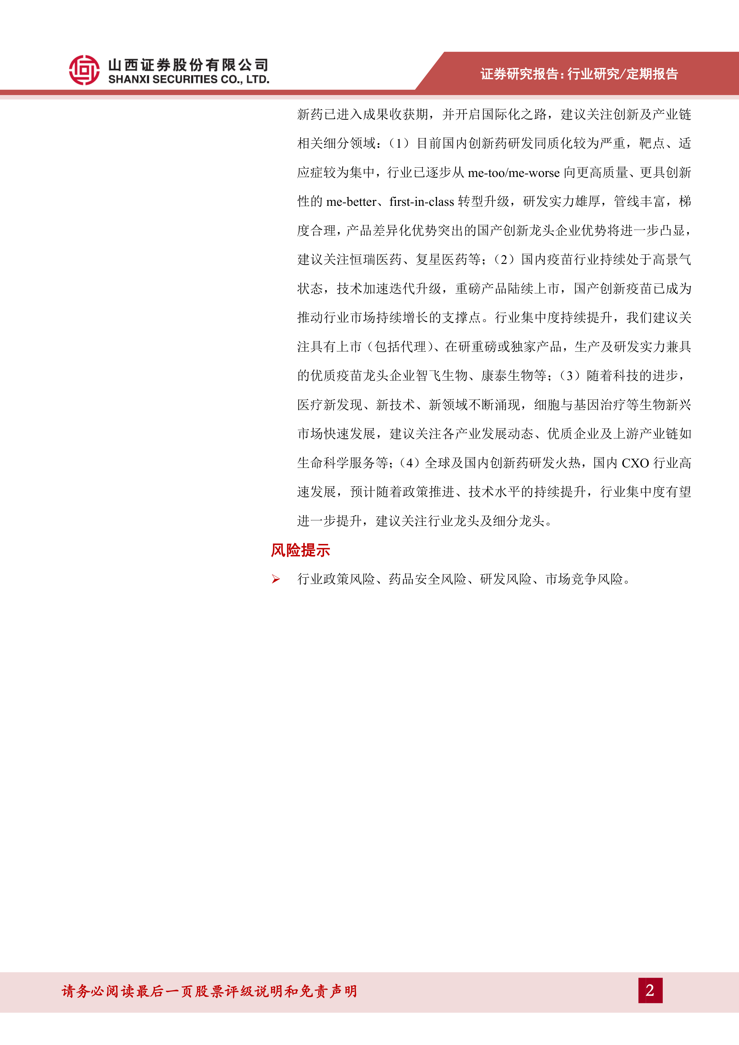 行业整体估值处于历史较低水平,产业发展趋势向好。长期来看,带量采购常态化持续加速行业分化,倒逼企业向创新转型;医保目录动态调整,持续加速创新药放量。政策、人才、资本等推动下,我国创新药已进入成果收获期,并开启国际化之路,建议关注创新及产业链相关细分领域:(1)目前国内创新药研发同质化较为严重,靶点、适应症较为集中,行业已逐步从me-too/me-worse向更高质量、更具创新性的me-better、first-in-class转型升级,研发实力雄厚,管线丰富,梯度合理,产品差异化优势突出的国产创新龙头企业优势将进一步凸显,建议关注恒瑞医药、复星医药等;(2)国内疫苗行业持续处于高景气状态,技术加速迭代升级,重磅产品陆续上市,国产创新疫苗已成为推动行业市场持续增长的支撑点。行业集中度持续提升,我们建议关注具有上市(包括代理)、在研重磅或独家产品,生产及研发实力兼具的优质疫苗龙头企业智飞生物、康泰生物等;(3)随着科技的进步,医疗新发现、新技术、新领域不断涌现,细胞与基因治疗等生物新兴市场快速发展,建议关注各产业发展动态、优质企业及上游产业链如生命科学服务等;(4)全球及国内创新药研发火热,国内CXO行业高速发展,预计随着政策推进、技术水平的持续提升,行业集中度有望进一步提升,建议关注行业龙头及细分龙头。