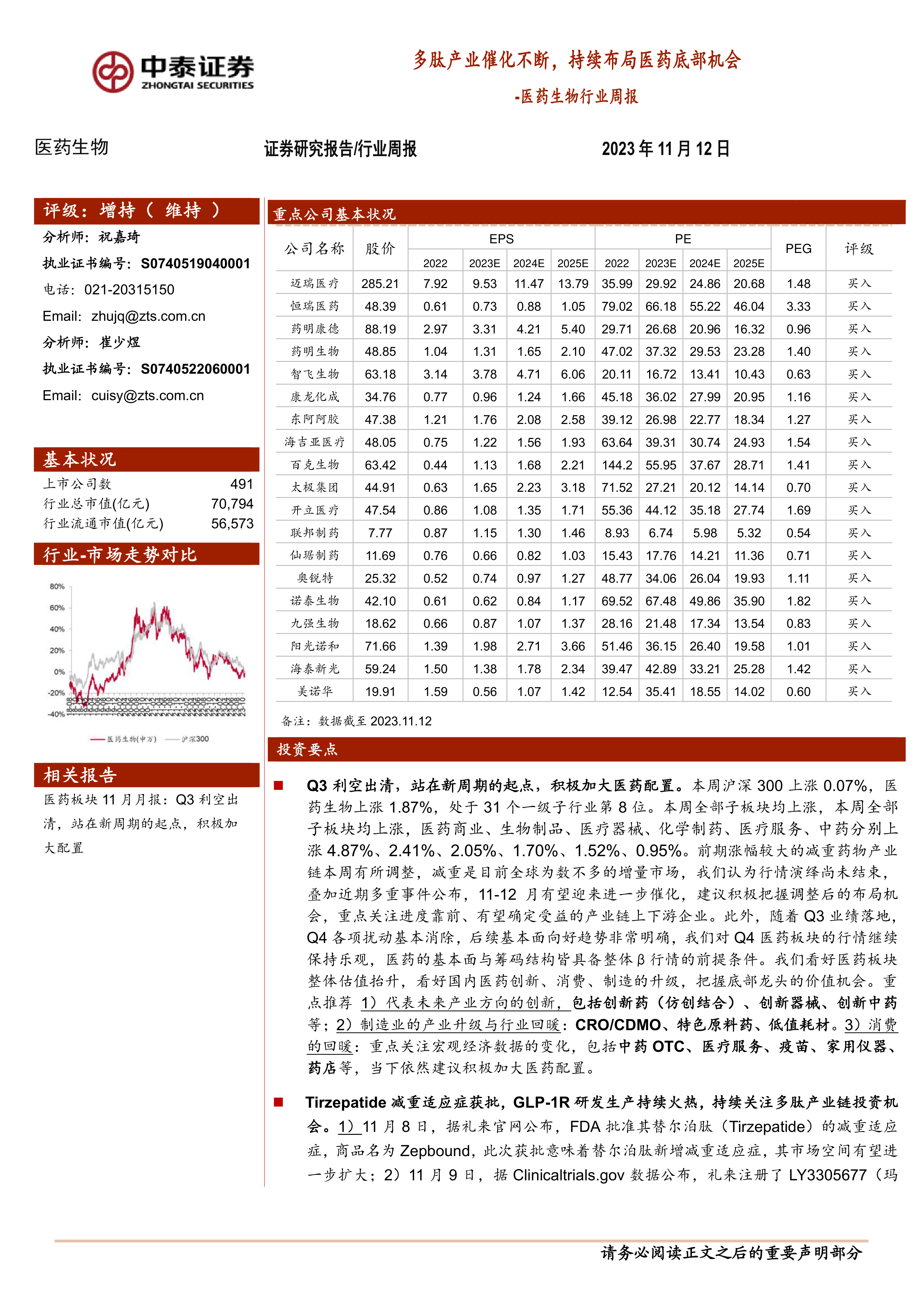 医药生物行业周报:多肽产业催化不断,持续布局医药底部机会