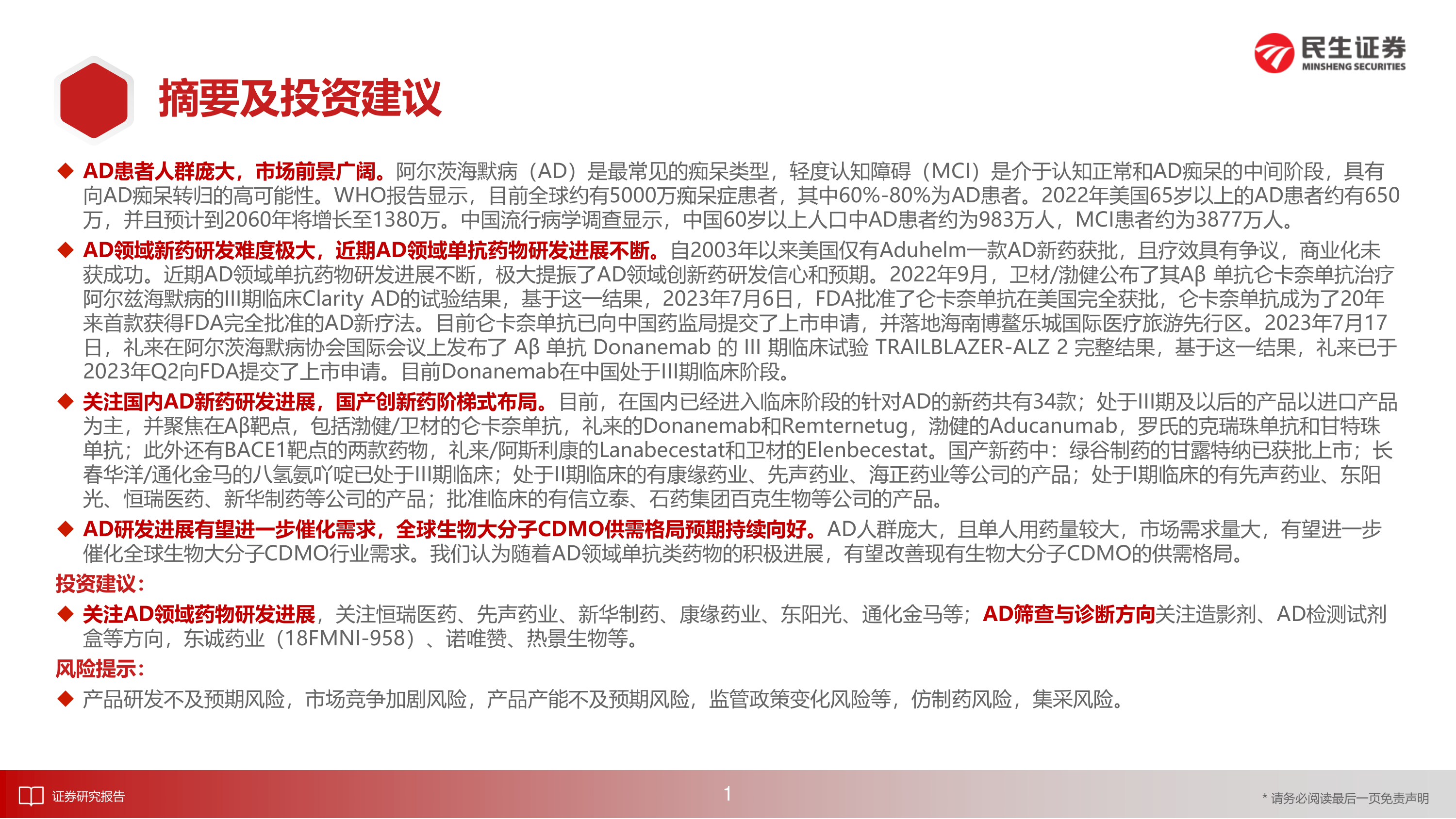 这些AD新药的进展,特别是大分子单抗药物的巨大用药需求,将显著催化全球生物大分子CDMO行业的发展。头部CDMO企业正积极扩张产能以应对这一趋势,预计将改善CDMO行业的供需格局,带来新的增长机遇。然而,AD领域仍面临产品研发不及预期、市场竞争加剧、产能限制以及监管政策变化、仿制药和集采等风险。投资者应密切关注AD领域药物研发进展,以及AD筛查与诊断方向的相关企业,同时审慎评估潜在风险。