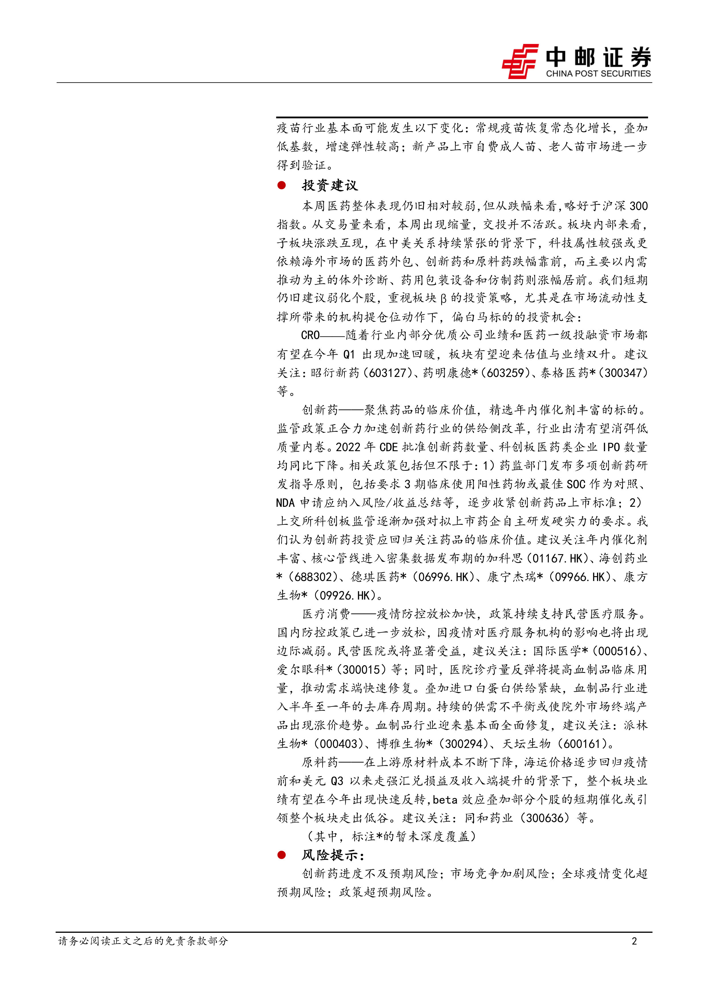 报告建议在当前市场流动性支撑下,弱化个股选择,重视板块的β效应,关注CRO、创新药、医疗消费、医疗新基建后周期和原料药等偏白马标的的投资机会。同时,报告也提示了创新药进度不及预期、市场竞争加剧、全球疫情变化超预期及政策风险等潜在挑战。