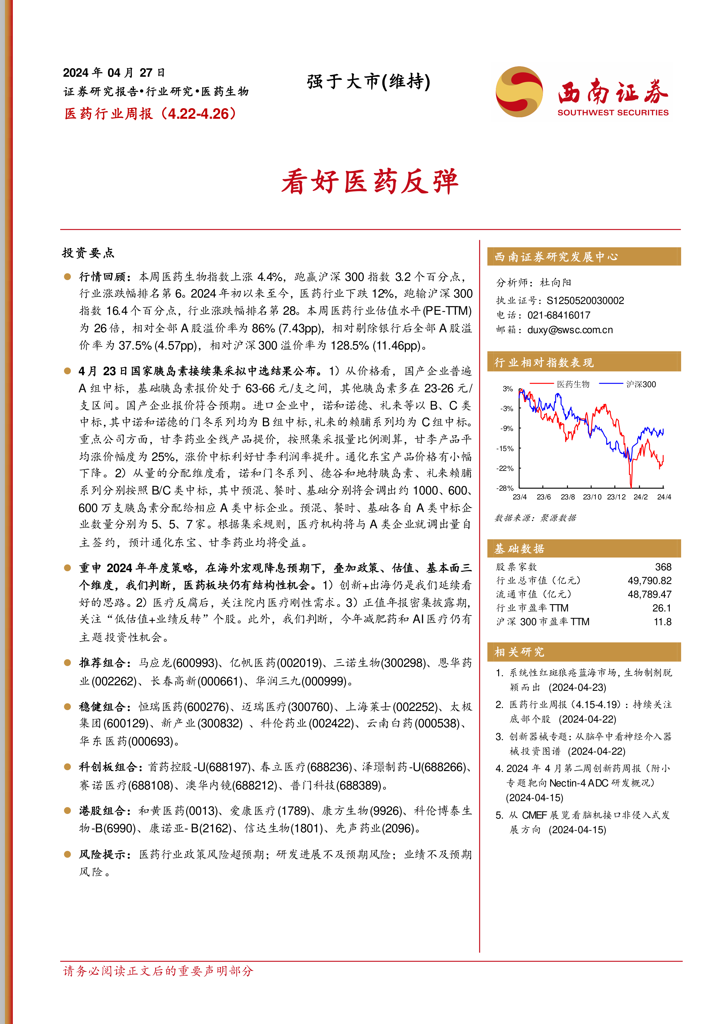 本周医药生物指数上涨4.4%,跑赢沪深300指数3.2个百分点,行业涨跌幅排名第6。年初至今,医药行业下跌12%,跑输沪深300指数16.4个百分点,排名第28。本周医药行业估值水平(PE-TTM)为26倍,相对全部A股溢价率为86%。4月23日国家胰岛素接续集采拟中选结果公布,国产企业普遍A组中标,基础胰岛素报价在63-66元/支,其他胰岛素在23-26元/支。甘李药业产品平均涨价25%,利好利润率提升;通化东宝产品价格小幅下降。量的分配上,诺和门冬系列、德谷和地特胰岛素、礼来赖脯系列分别按B/C类中标,预计通化东宝、甘李药业将受益。2024年年度策略重申“创新+出海”、院内医疗刚性需求、“低估值+业绩反转”以及减肥药和AI医疗的主题投资机会。报告推荐了马应龙、亿帆医药、三诺生物等推荐组合,恒瑞医药、迈瑞医疗等稳健组合,首药控股-U、春立医疗等科创板组合,以及和黄医药、爱康医疗等港股组合。