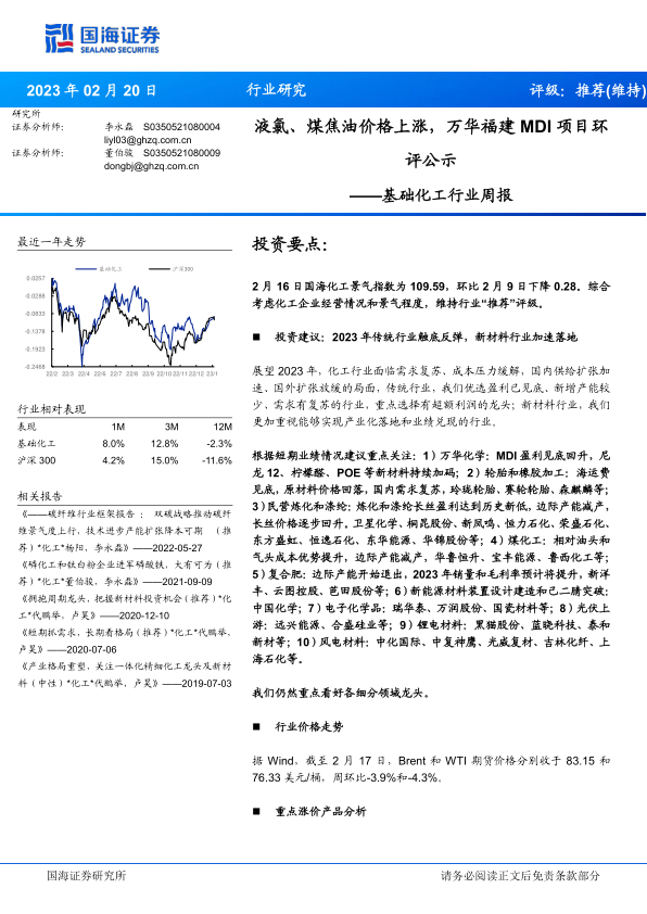 根据短期业绩情况建议重点关注:1)万华化学:MDI盈利见底回升,尼龙12、柠檬醛、POE等新材料持续加码;2)轮胎和橡胶加工:海运费见底,原材料价格回落,国内需求复苏,玲珑轮胎、赛轮轮胎、森麒麟等;3)民营炼化和涤纶:炼化和涤纶长丝盈利达到历史新低,边际产能减产,长丝价格逐步回升。卫星化学、桐昆股份、新凤鸣、恒力石化、荣盛石化、东方盛虹、恒逸石化、东华能源、华锦股份等;4)煤化工:相对油头和气头成本优势提升,边际产能减产,华鲁恒升、宝丰能源、鲁西化工等;5)复合肥:边际产能开始退出,2023年销量和毛利率预计将提升,新洋丰、云图控股、芭田股份等;6)新能源材料装置设计建造和己二腈突破:中国化学;7)电子化学品:瑞华泰、万润股份、国瓷材料等;8)光伏上游:远兴能源、合盛硅业等;9)锂电材料:黑猫股份、蓝晓科技、泰和新材等;10)风电材料:中化国际、中复神鹰、光威复材、吉林化纤、上海石化等。