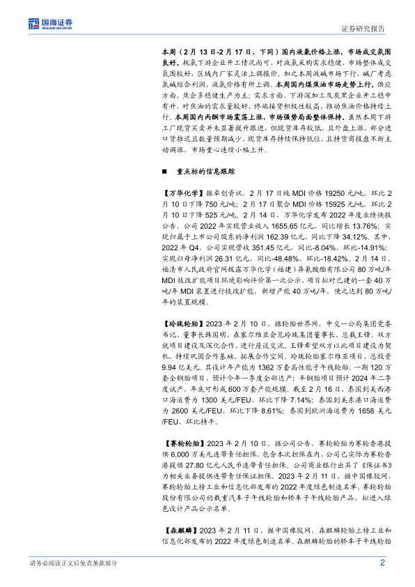 【万华化学】据卓创资讯,2月17日纯MDI价格19250元/吨,环比2月10日下降750元/吨;2月17日聚合MDI价格15925元/吨,环比2月10日下降525元/吨。2月14日,万华化学发布2022年度业绩快报公告,公司2022年实现营业收入1655.65亿元,同比增长13.76%;实现归属于上市公司股东的净利润162.39亿元,同比下降34.12%。其中,2022年Q4,公司实现营收351.45亿元,同比-8.04%,环比-14.91%;实现归母净利润26.31亿元,同比-48.48%,环比-18.42%。2月14日,福清市人民政府官网披露万华化学(福建)异氰酸酯有限公司80万吨/年MDI技改扩能项目环境影响评价第一次公示,项目拟对已建的一套40万吨/年MDI装置进行技改扩能,新增产能40万吨/年,使之达到80万吨/年的装置规模。