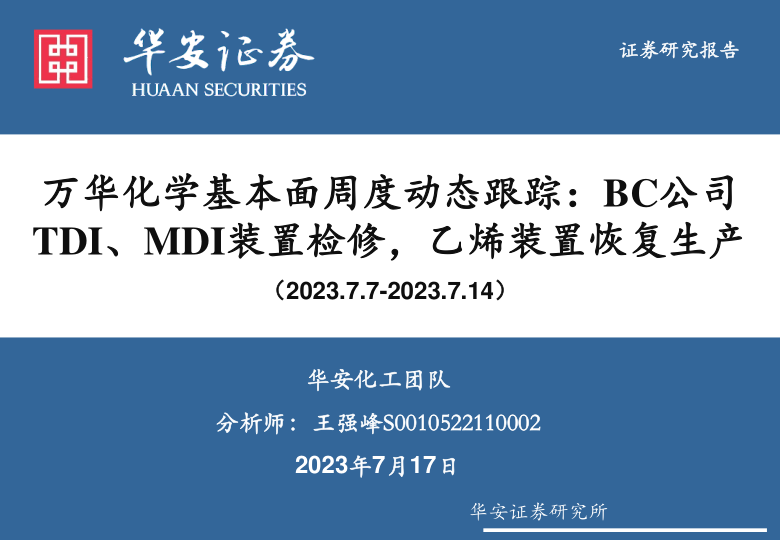 万华化学基本面周度动态跟踪:BC公司TDI、MDI装置检修,乙烯装置恢复生产