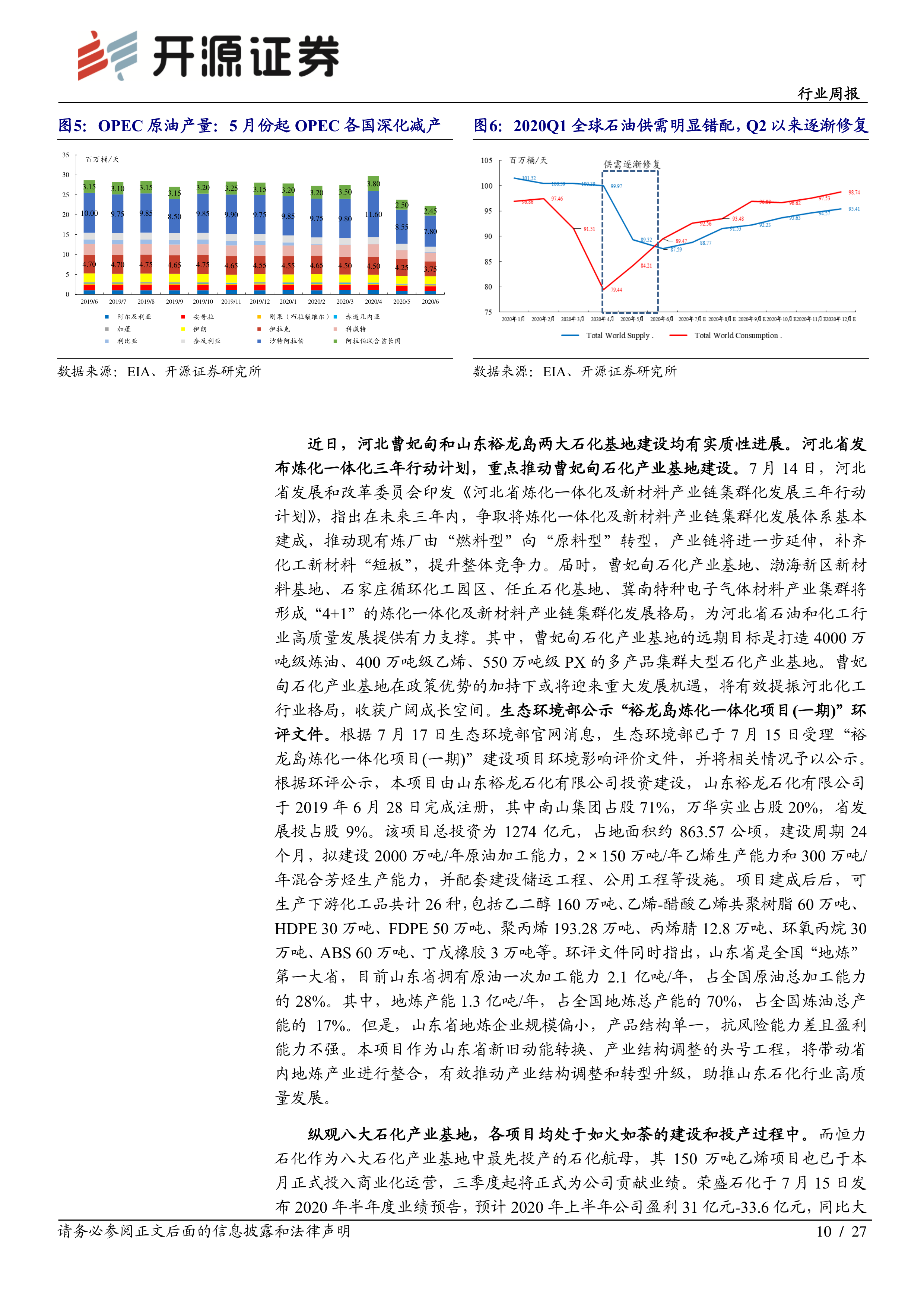 河北曹妃甸和山东裕龙岛两大石化基地建设均取得实质性进展。河北省发布炼化一体化三年行动计划,重点推动曹妃甸石化产业基地建设,远期目标是打造4000万吨级炼油、400万吨级乙烯、550万吨级PX的多产品集群大型石化产业基地。生态环境部受理“裕龙岛炼化一体化项目(一期)”环评文件,该项目总投资1274亿元,拟建设2000万吨/年原油加工能力,2×150万吨/年乙烯生产能力和300万吨/年混合芳烃生产能力,建成后可生产26种下游化工品。该项目作为山东省新旧动能转换的头号工程,将有效推动产业结构调整和转型升级。民营炼化行业龙头如恒力石化、荣盛石化已率先投产并储备低成本原油,三季度将全面迎来业绩释放期。