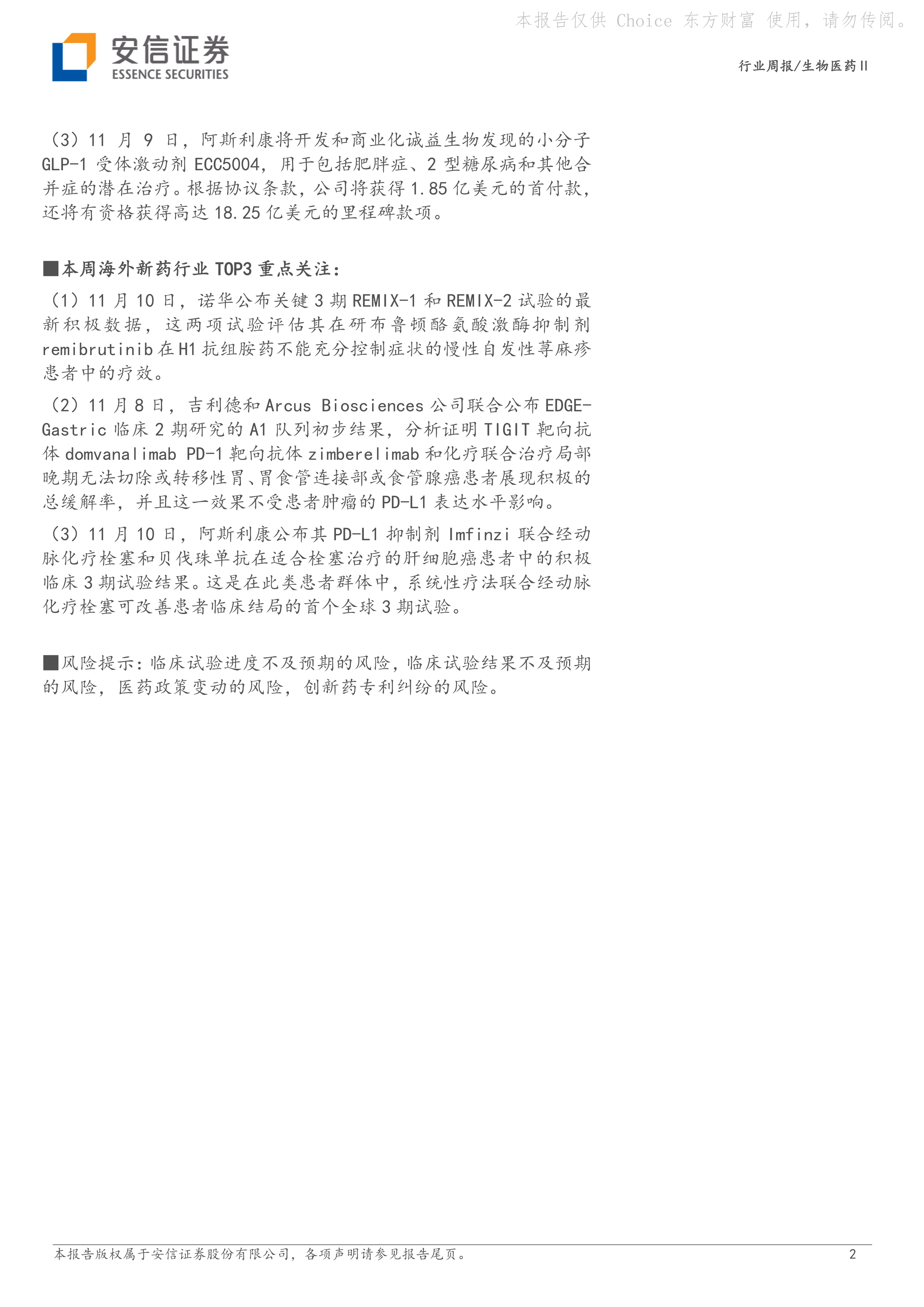 (3) 11 月 10 日, 阿斯利康公布其 PD-L1 抑制剂 Imfinzi 联合经动脉化疗栓塞和贝伐珠单抗在适合栓塞治疗的肝细胞癌患者中的积极临床 3 期试验结果。这是在此类患者群体中,系统性疗法联合经动脉化疗栓塞可改善患者临床结局的首个全球 3 期试验。