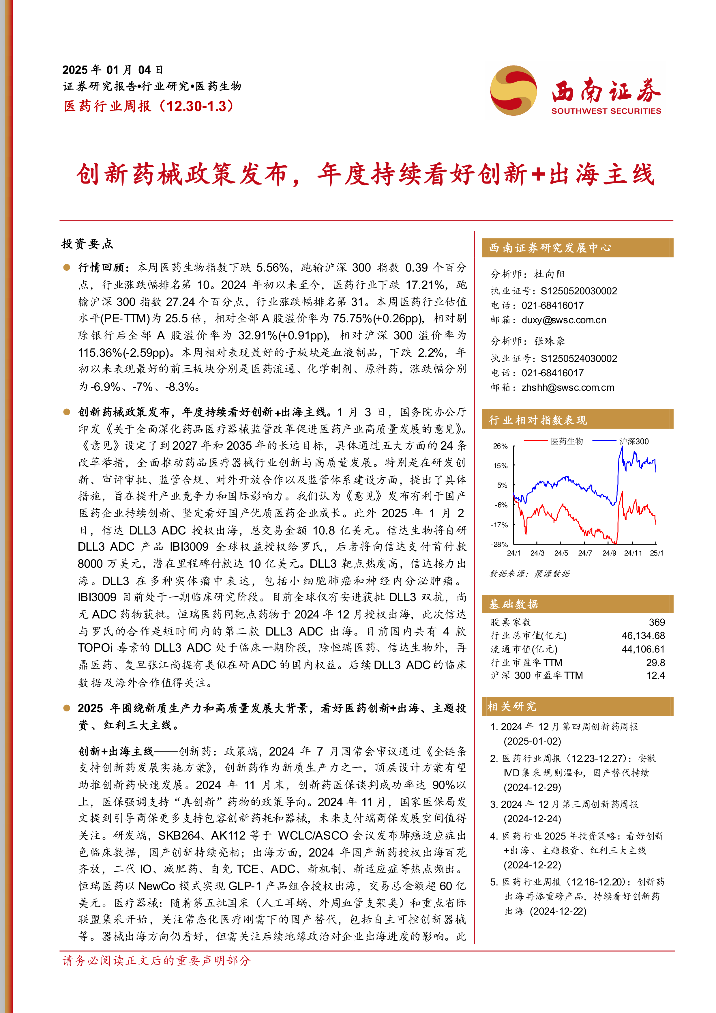 创新药械政策发布,年度持续看好创新+出海主线。1月3日,国务院办公厅印发《关于全面深化药品医疗器械监管改革促进医药产业高质量发展的意见》。《意见》设定了到2027年和2035年的长远目标,具体通过五大方面的24条改革举措,全面推动药品医疗器械行业创新与高质量发展。特别是在研发创新、审评审批、监管合规、对外开放合作以及监管体系建设方面,提出了具体措施,旨在提升产业竞争力和国际影响力。我们认为《意见》发布有利于国产医药企业持续创新、坚定看好国产优质医药企业成长。此外2025年1月2日,信达DLL3ADC授权出海,总交易金额10.8亿美元。信达生物将自研DLL3ADC产品IBI3009全球权益授权给罗氏,后者将向信达支付首付款8000万美元,潜在里程碑付款达10亿美元。DLL3靶点热度高,信达接力出海。DLL3在多种实体瘤中表达,包括小细胞肺癌和神经内分泌肿瘤。IBI3009目前处于一期临床研究阶段。目前全球仅有安进获批DLL3双抗,尚无ADC药物获批。恒瑞医药同靶点药物于2024年12月授权出海,此次信达与罗氏的合作是短时间内的第二款DLL3ADC出海。目前国内共有4款TOPOi毒素的DLL3ADC处于临床一期阶段,除恒瑞医药、信达生物外,再鼎医药、复旦张江尚握有类似在研ADC的国内权益。后续DLL3ADC的临床数据及海外合作值得关注。