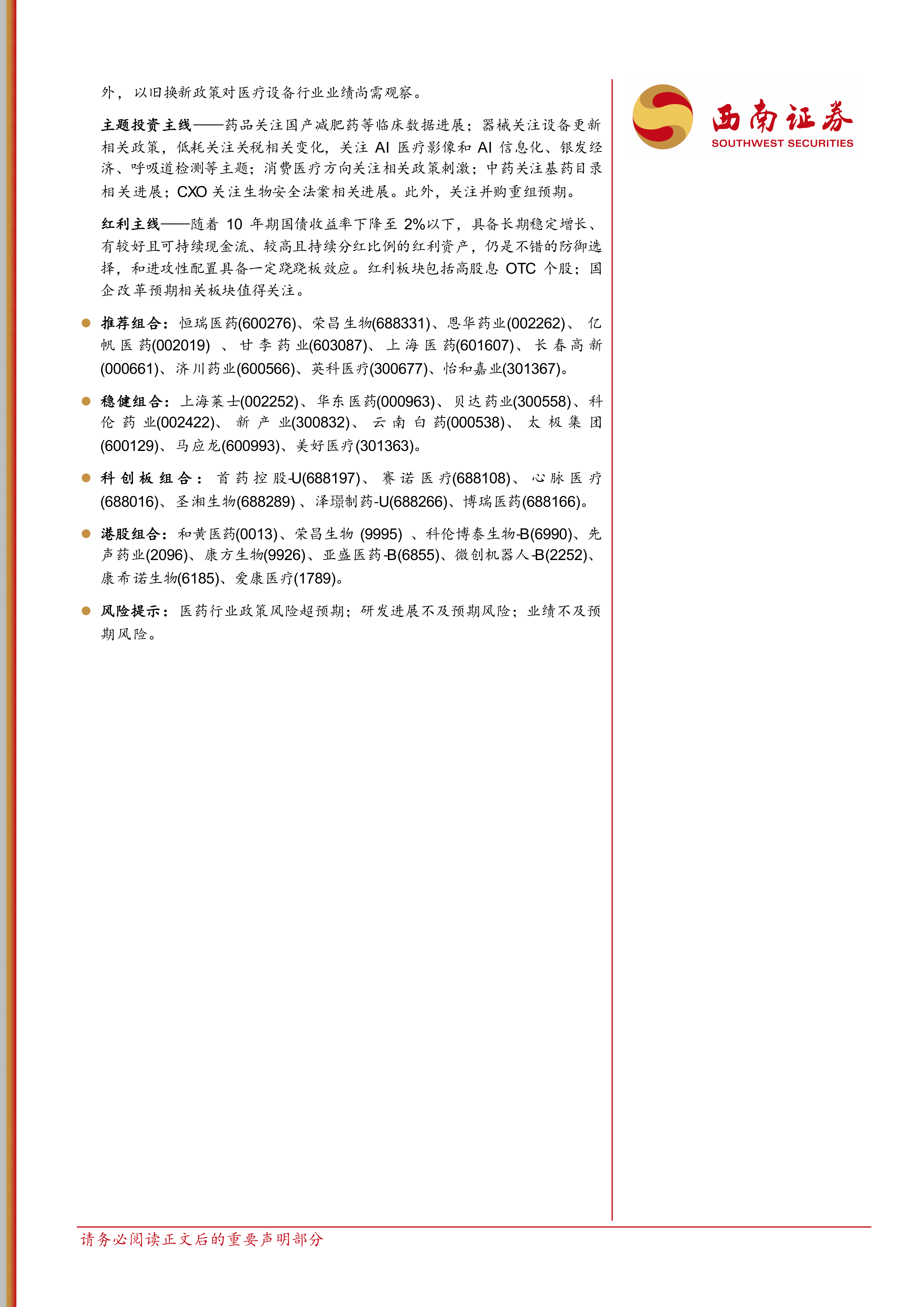 风险提示:医药行业政策风险超预期;研发进展不及预期风险;业绩不及预期风险。
