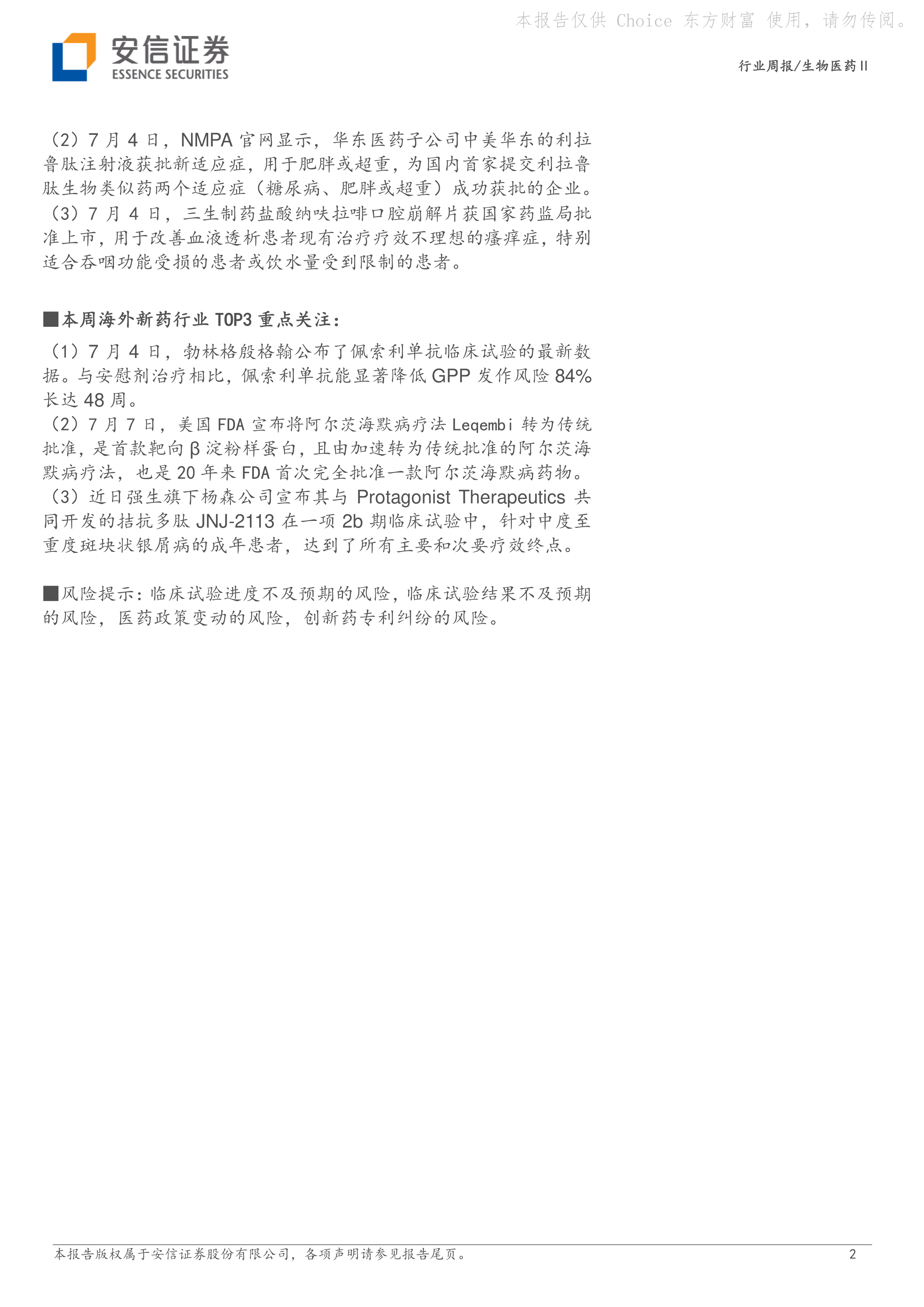 风险提示:临床试验进度不及预期的风险,临床试验结果不及预期的风险,医药政策变动的风险,创新药专利纠纷的风险。