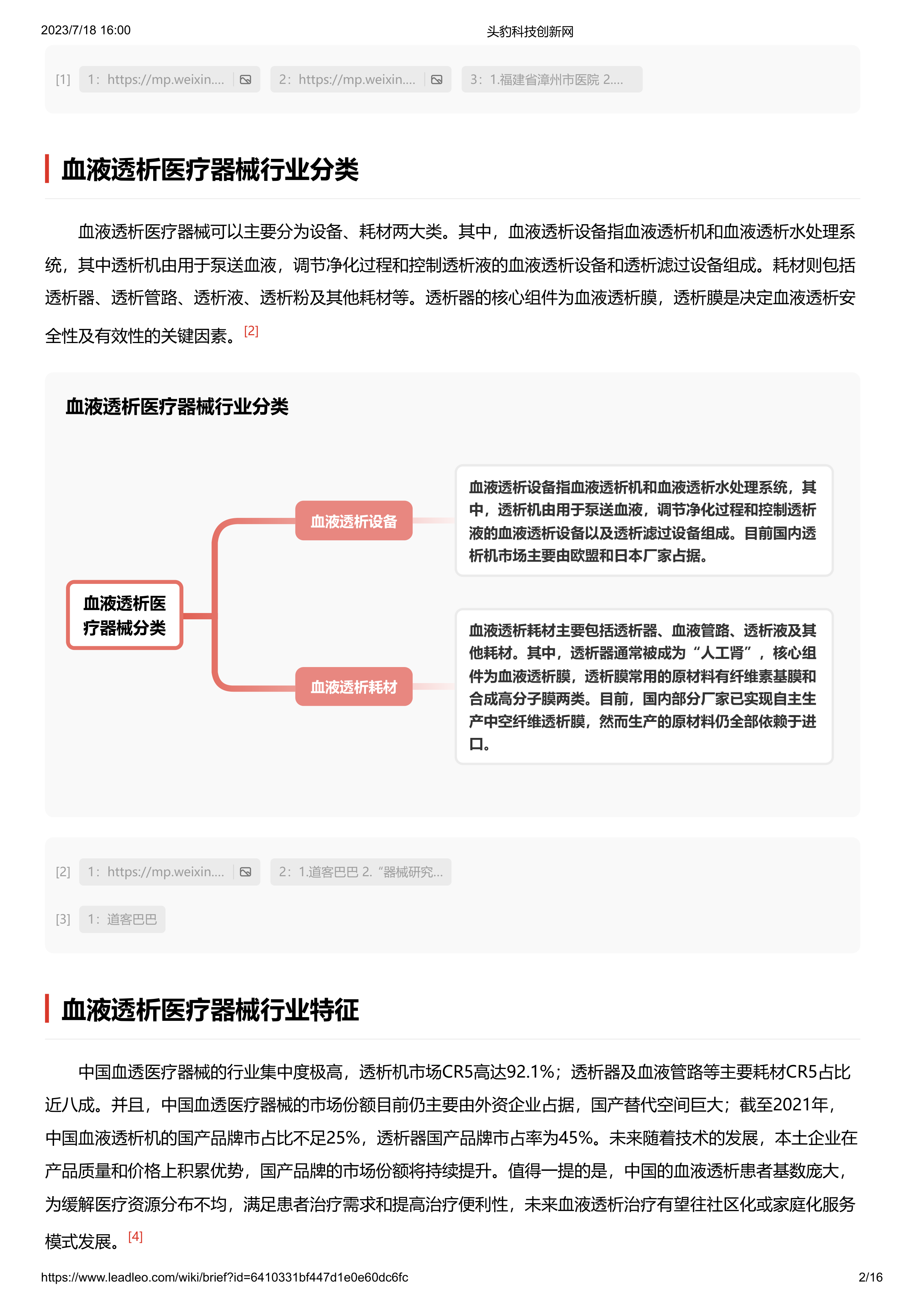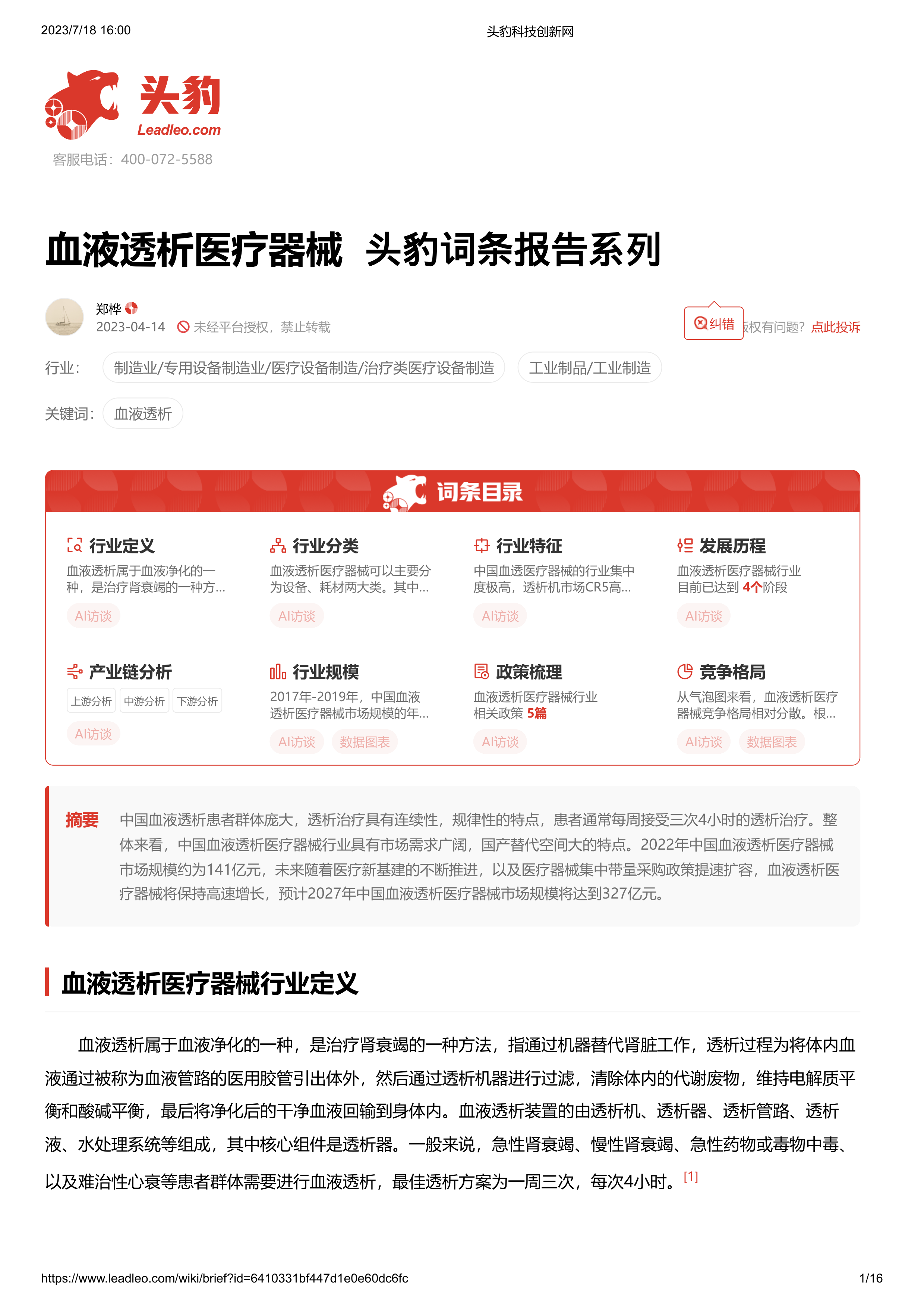 血液透析医疗器械 头豹词条报告系列