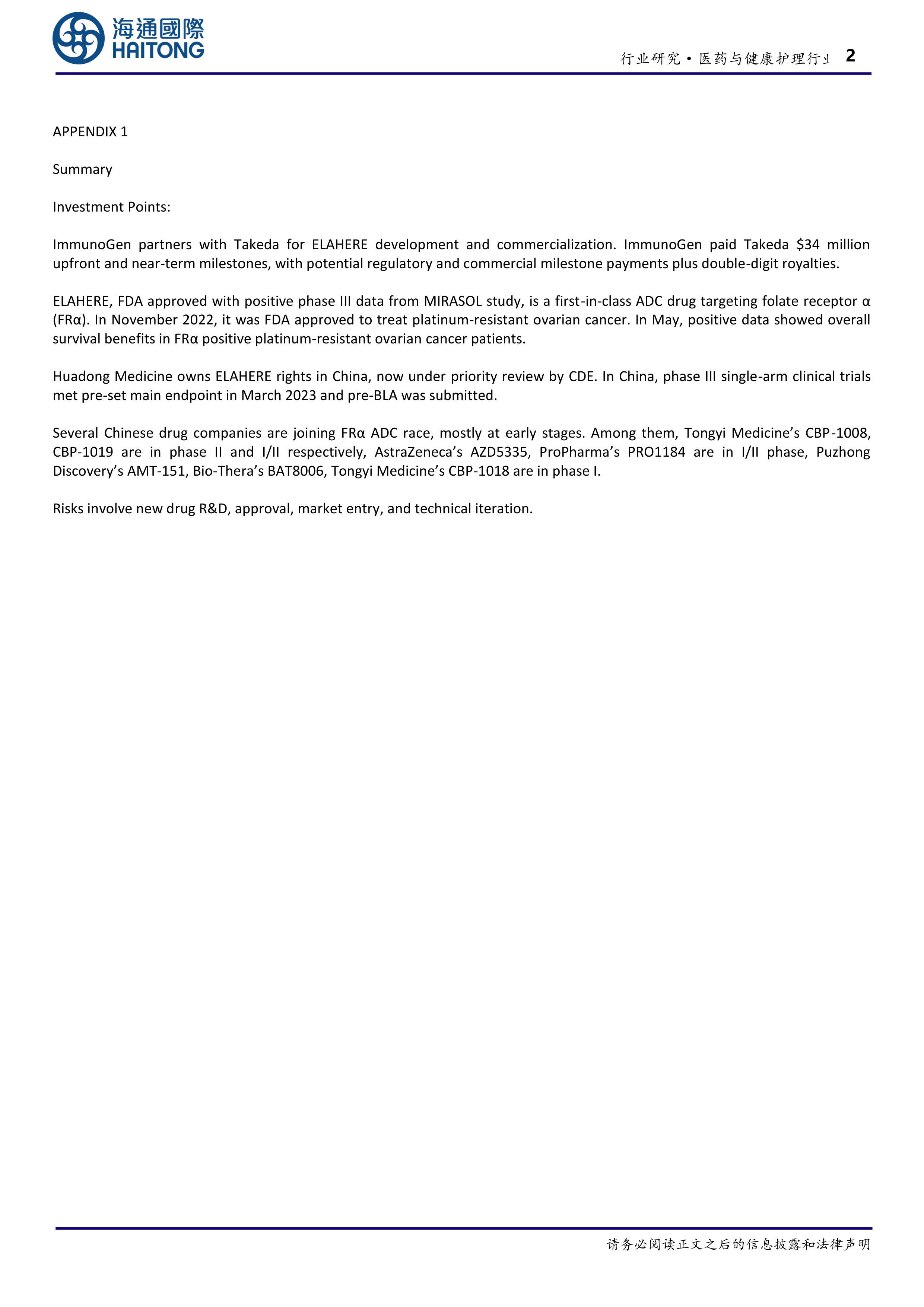 本报告通过分析武田制药引进ELAHERE的案例,揭示了FRα ADC药物的市场潜力。同时,报告也关注到国内药企在这一赛道的积极布局,尽管多数管线仍处于早期阶段,但预示着未来该领域的竞争将日趋激烈。投资者应关注相关企业的研发进展、临床数据以及市场策略,以把握投资机会。
