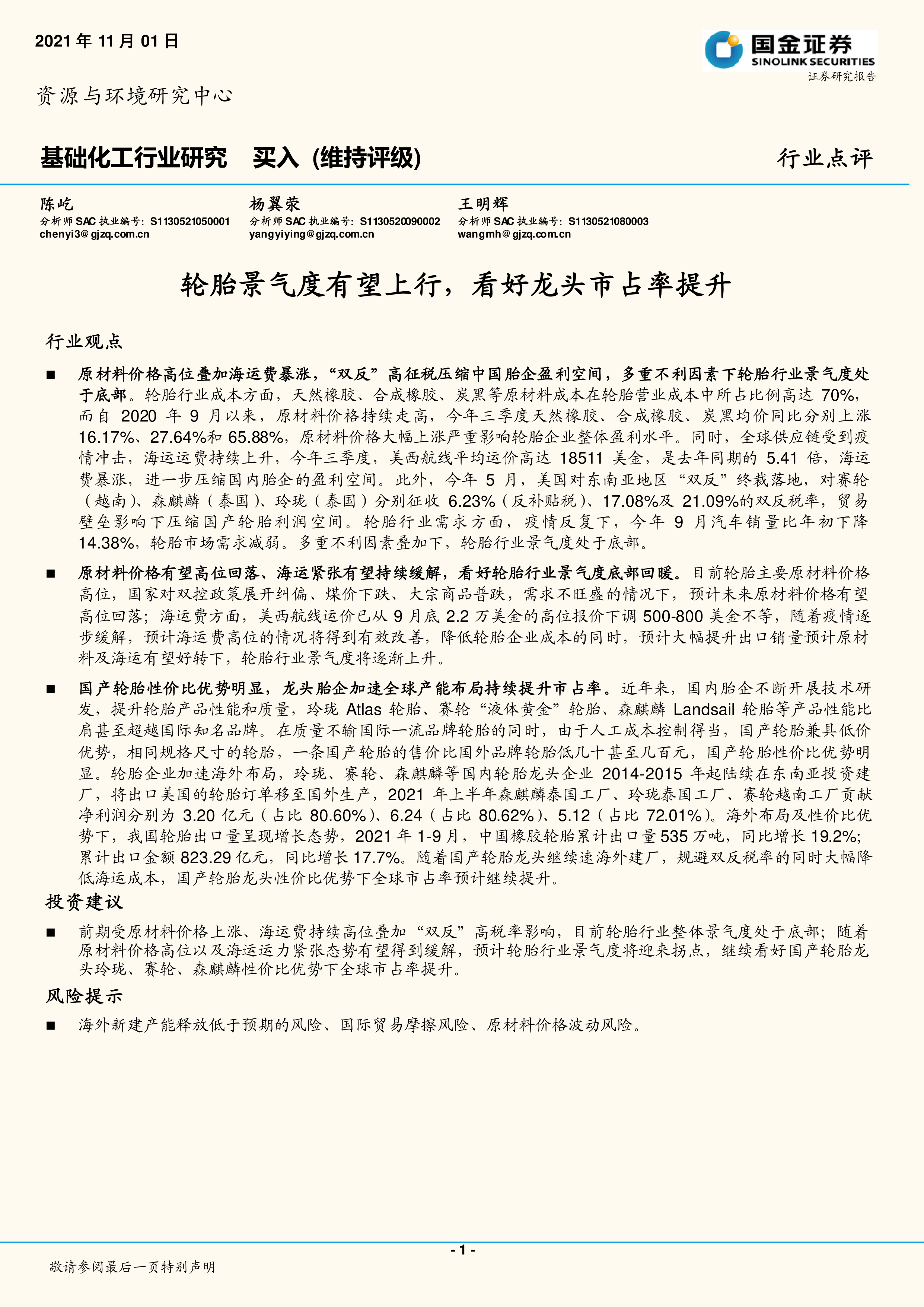 报告分析指出,受原材料价格高企、海运费暴涨以及“双反”关税等多重不利因素影响,轮胎行业景气度目前处于底部。但随着原材料价格有望回落、海运紧张局面缓解,行业景气度有望迎来拐点。
