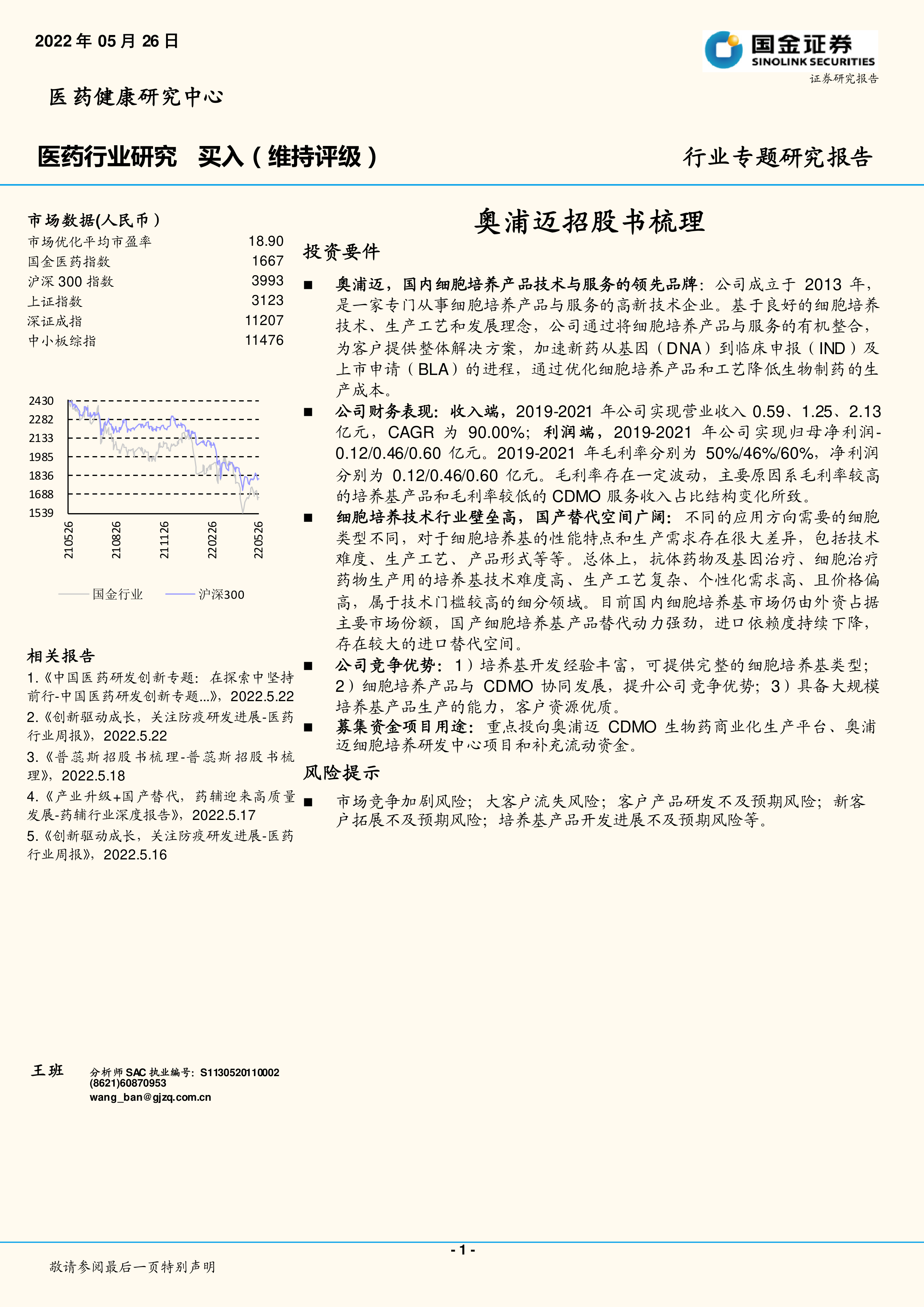 奥浦迈, 国内细胞培养产品技术与服务的领先品牌:公司成立于 2013 年,是一家专门从事细胞培养产品与服务的高新技术企业。基于良好的细胞培养技术、生产工艺和发展理念,公司通过将细胞培养产品与服务的有机整合,为客户提供整体解决方案,加速新药从基因( DNA)到临床申报( IND)及上市申请( BLA)的进程,通过优化细胞培养产品和工艺降低生物制药的生产成本。