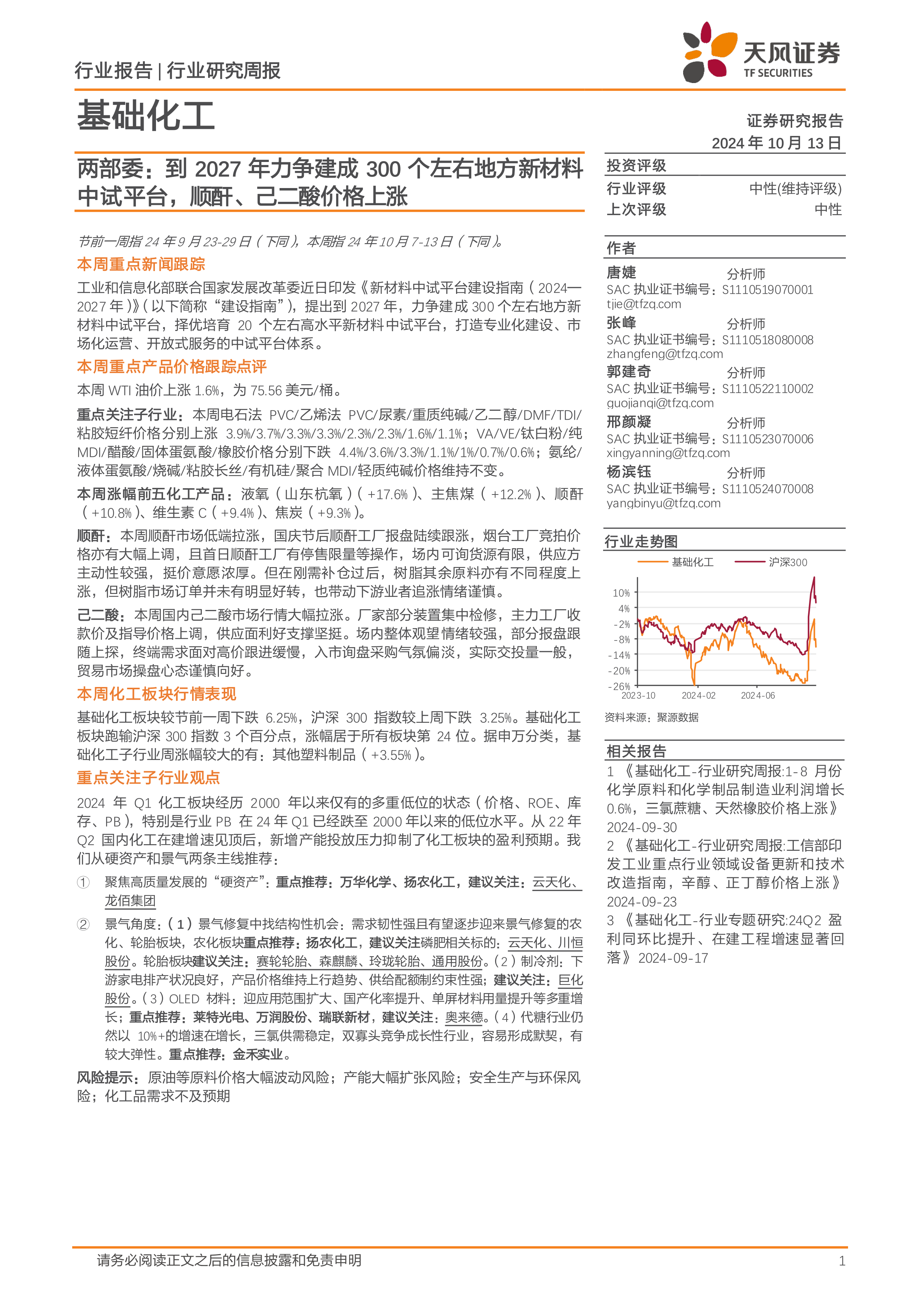 基础化工行业研究周报:两部委,到2027年力争建成300个左右地方新材料中试平台,顺酐、己二酸价格上涨