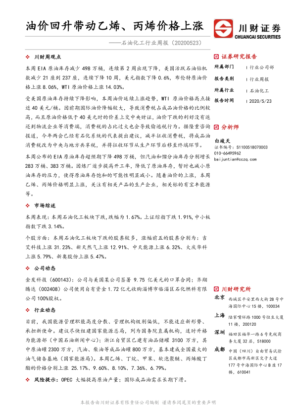 石油化工行业周报:油价回升带动乙烯、丙烯价格上涨