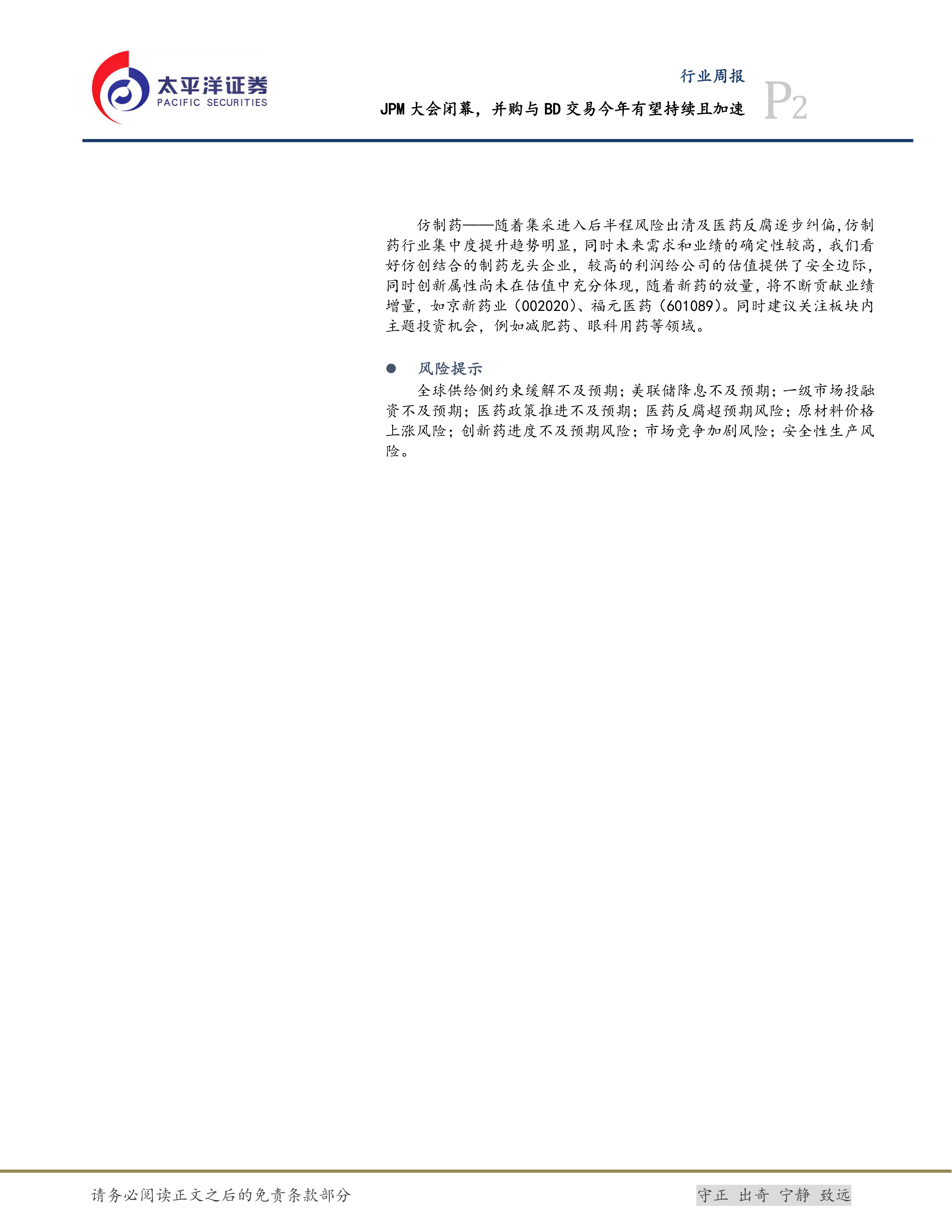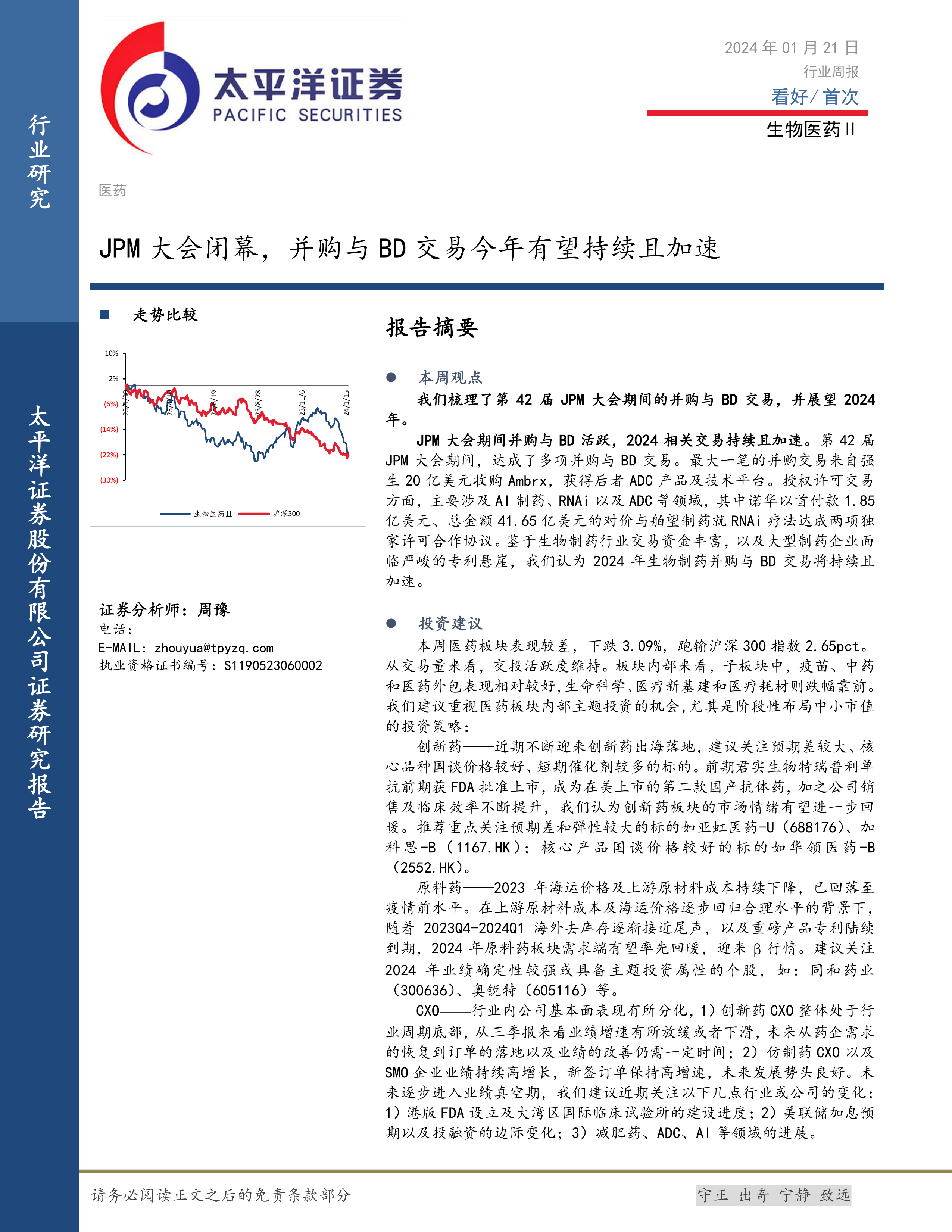 生物医药Ⅱ行业周报:JPM大会闭幕,并购与BD交易今年有望持续且加速