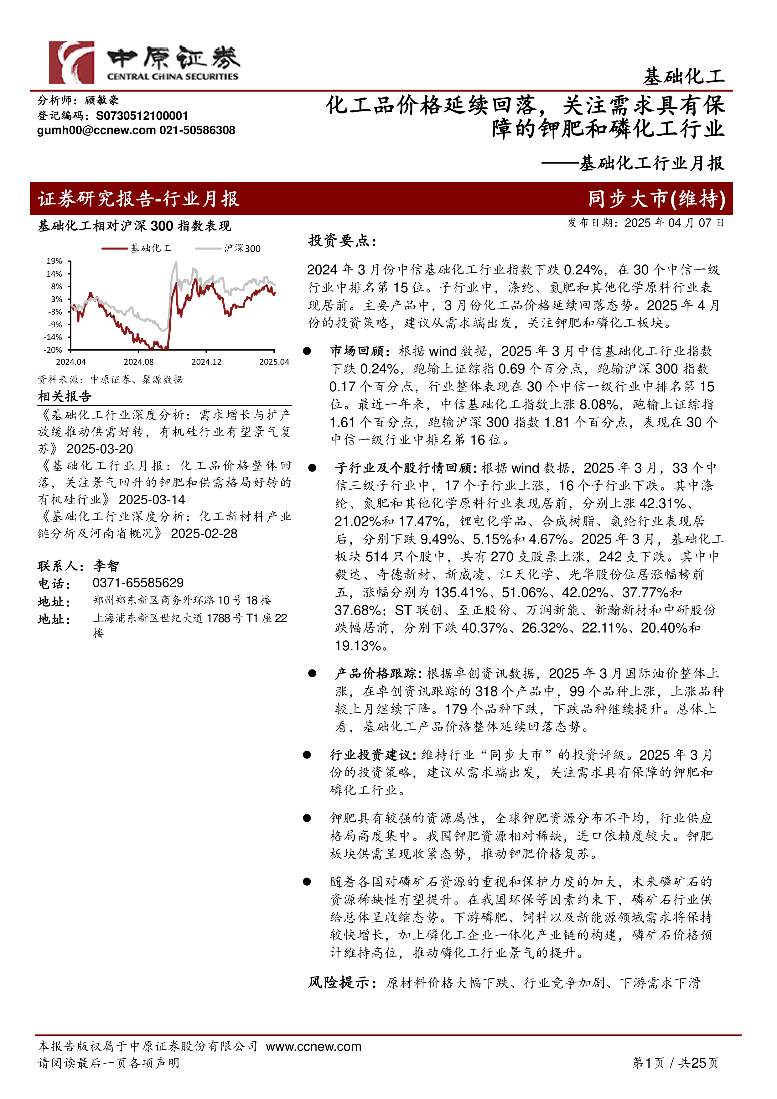 行业投资建议:维持行业“同步大市”的投资评级。2025年3月份的投资策略,建议从需求端出发,关注需求具有保障的钾肥和磷化工行业。