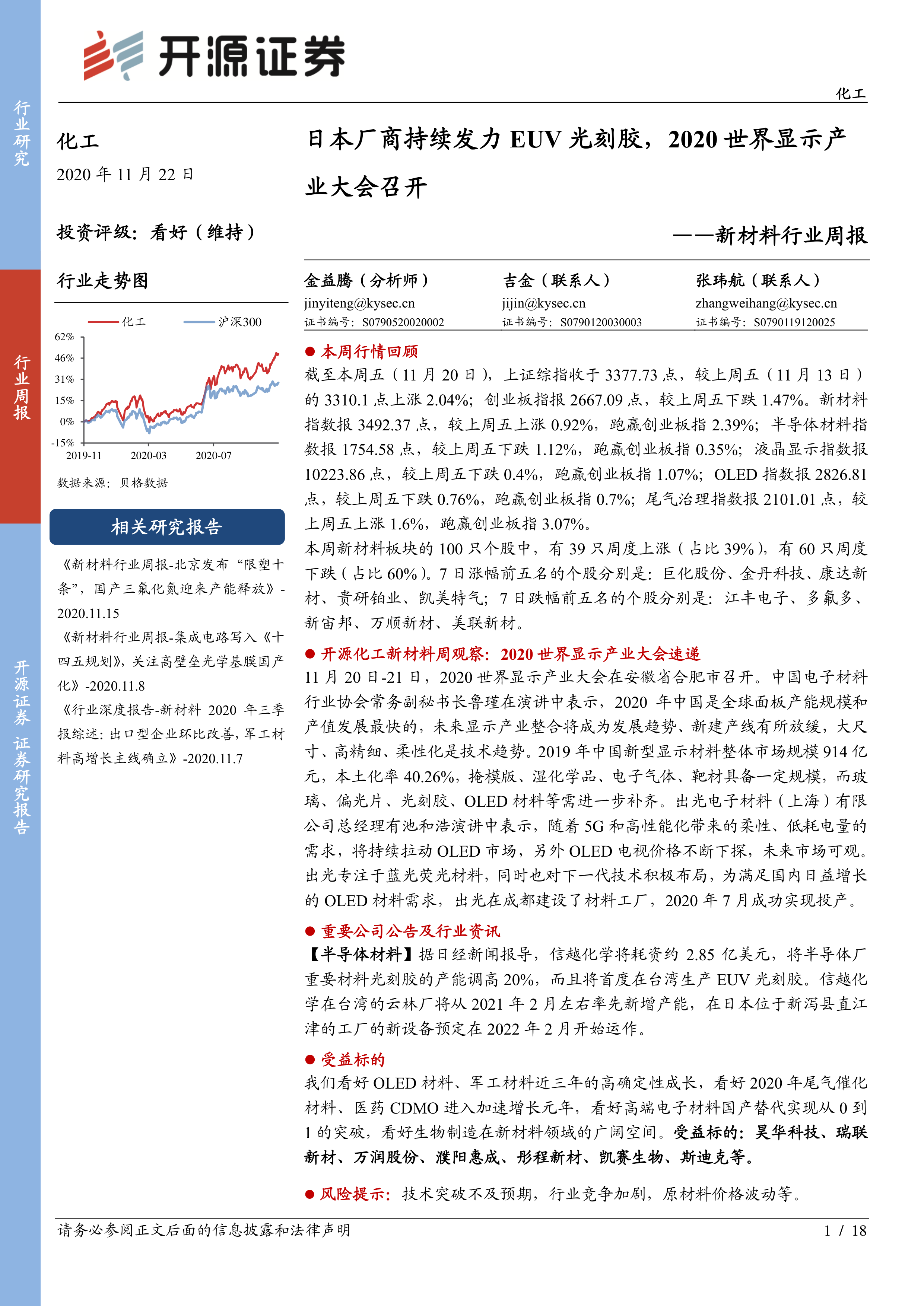 化工新材料行业周报:日本厂商持续发力EUV光刻胶,2020世界显示产业大会召开
