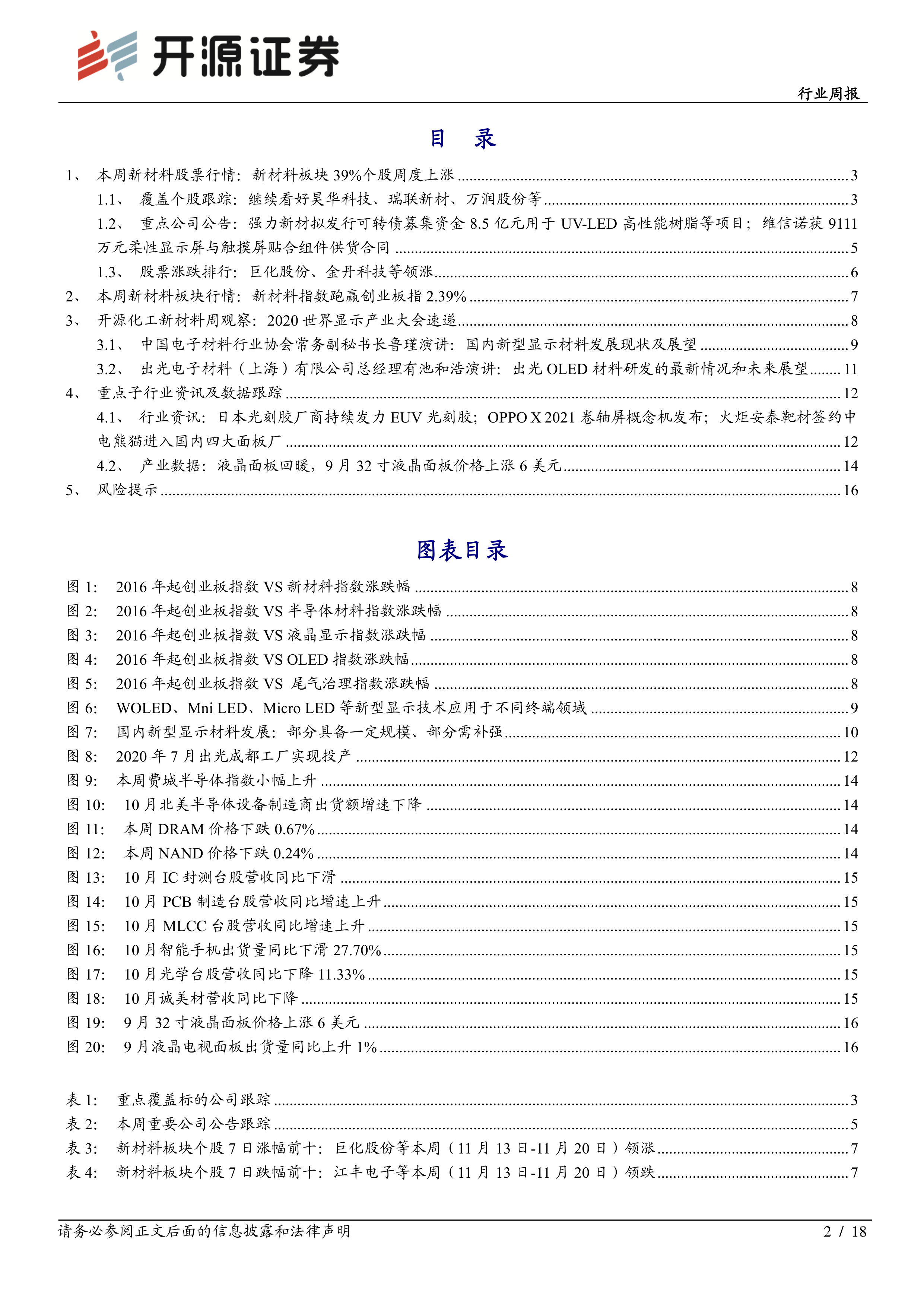 本报告核心观点指出,在2020年11月13日至11月20日期间,新材料板块整体表现优于大盘,尤其在细分领域如尾气治理方面展现出显著增长潜力。同时,全球显示产业正经历深刻的整合与技术升级,中国在全球面板产能和产值方面占据主导地位,并持续推动新型显示材料的本土化进程。