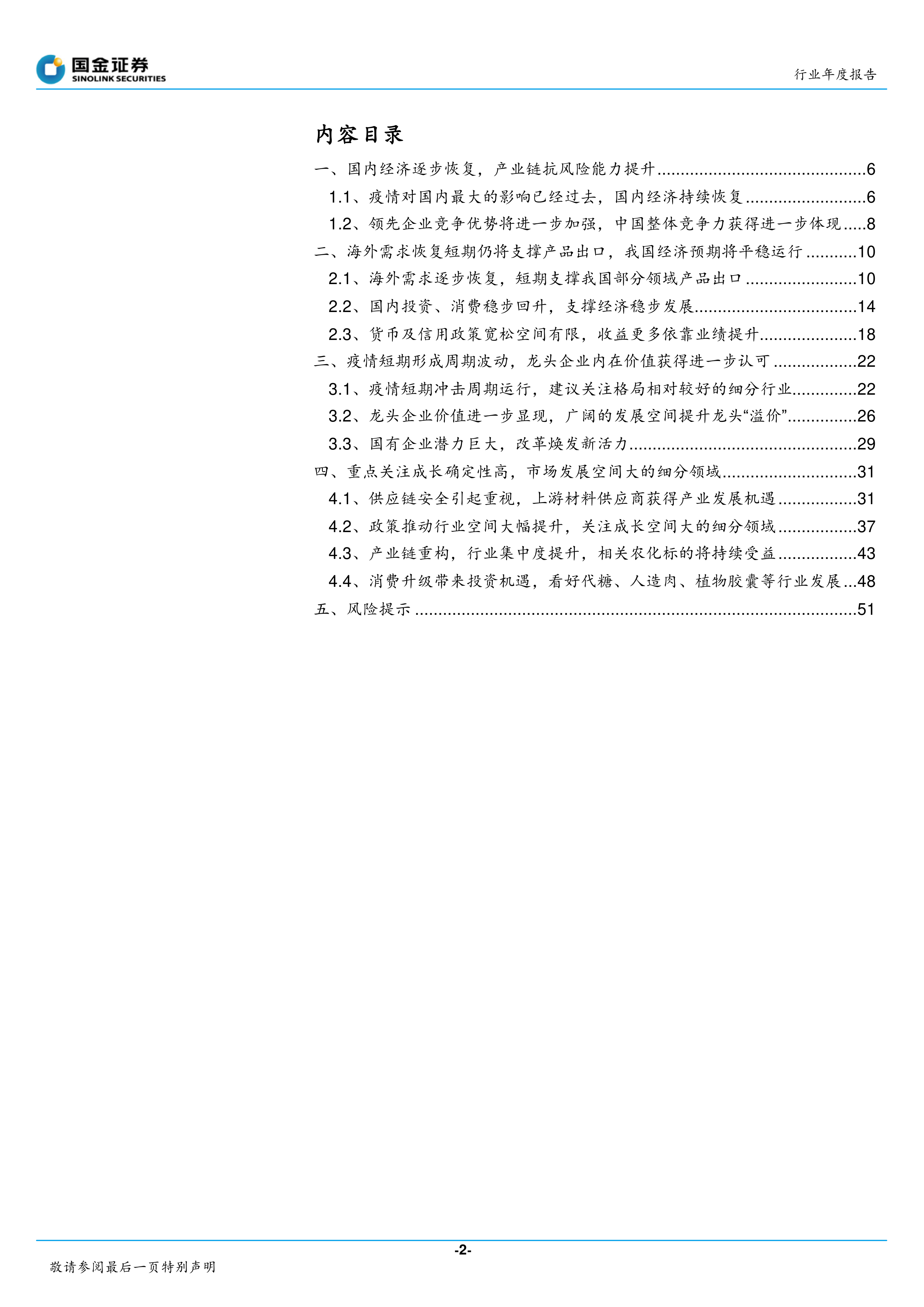 本报告核心观点指出,在全球经济景气复苏的背景下,中国经济在有效管控疫情后展现出强大的韧性和快速恢复能力。国内第一、第二产业已基本恢复至疫情前水平,制造业PMI连续9个月位于50以上,化工行业工业增加值甚至超越疫情前。这不仅得益于国内疫情的有效控制和生产经营的迅速恢复,更凸显了中国制造业,特别是化工行业,在抗风险能力、成本优势、完整产业链及巨大市场方面的独特优势。海外需求的逐步恢复,加之中国稳定的供应能力,使得我国有望承接更多全球订单,短期内支撑产品出口。