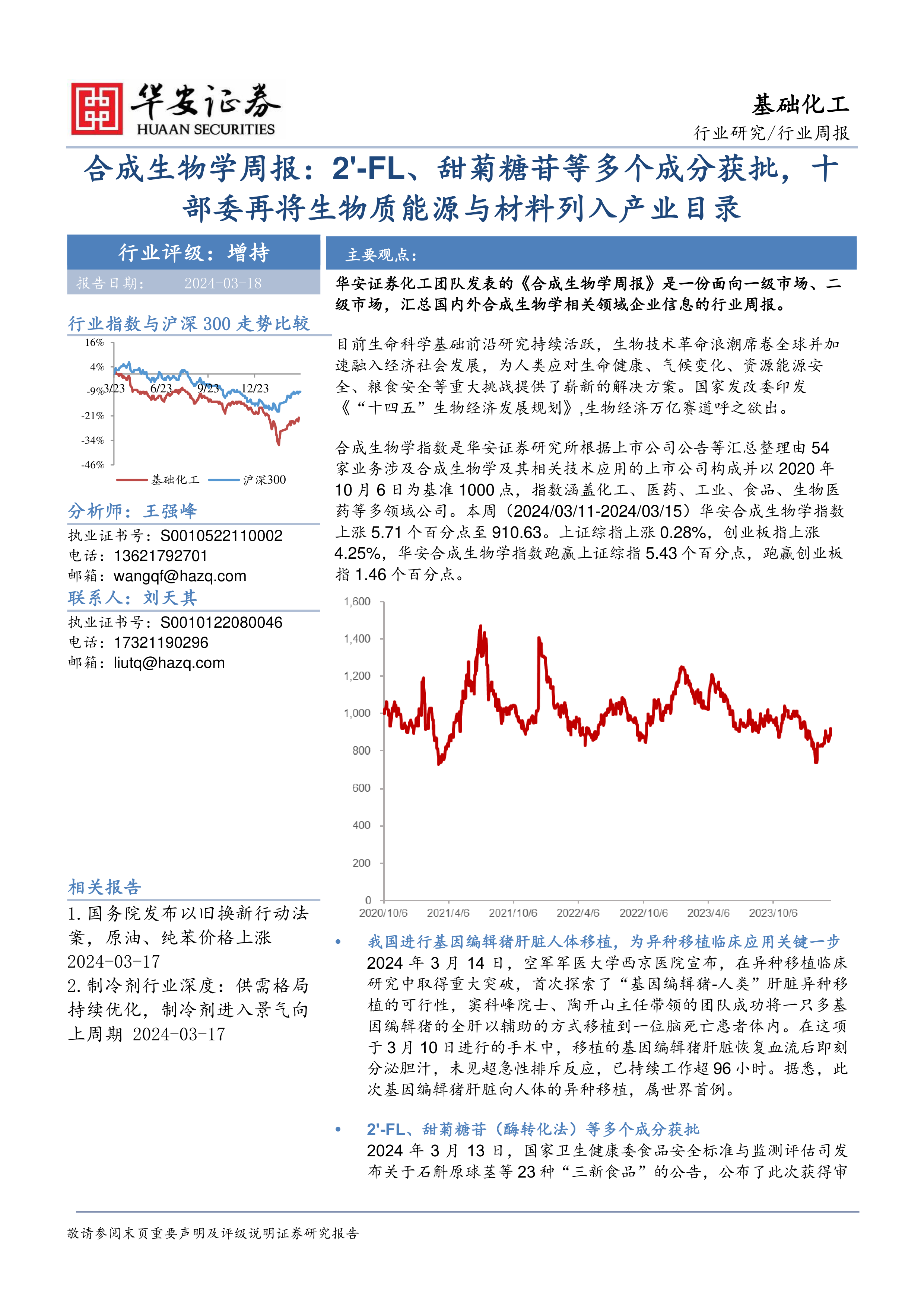 基础化工行业周报:合成生物学周报:2'-FL、甜菊糖苷等多个成分获批,十部委再将生物质能源与材料列入产业目录
