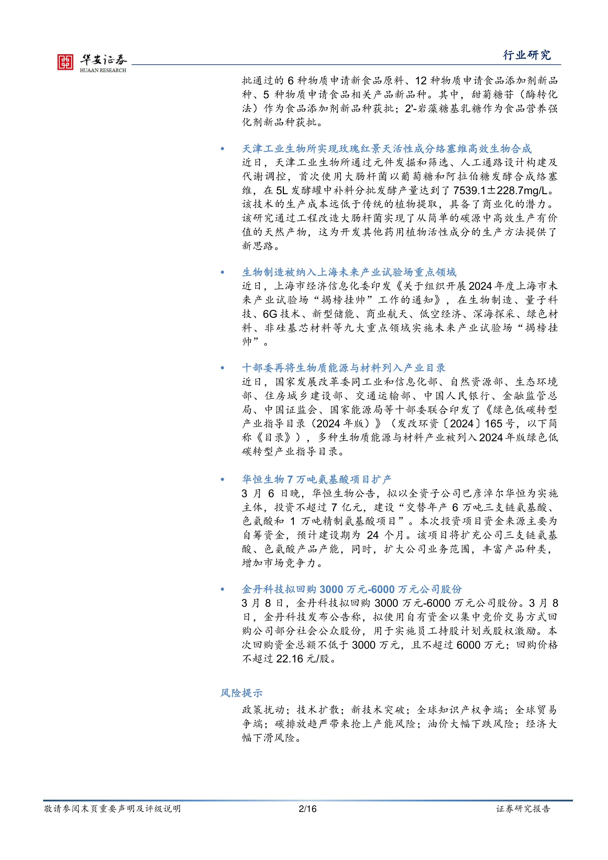 市场表现上,华安合成生物学指数跑赢大盘,显示出资本市场对该领域的积极预期。企业层面,东部湾控股、金发科技、华塑股份等国内企业在生物基材料生产方面取得重要进展,沙索与托普索、韩国CJ等国际巨头也积极布局可持续生物燃料和生物塑料。同时,行业融资活动活跃,多家合成生物学初创公司获得数千万至数亿元人民币的投资,进一步加速了技术转化和产业化进程。科研动态方面,多项前沿研究揭示了微生物、酶、基因编辑和蛋白质领域的最新发现,为合成生物学的发展提供了理论和技术支撑。尽管行业前景广阔,但仍需关注政策、技术、贸易和经济波动等潜在风险。