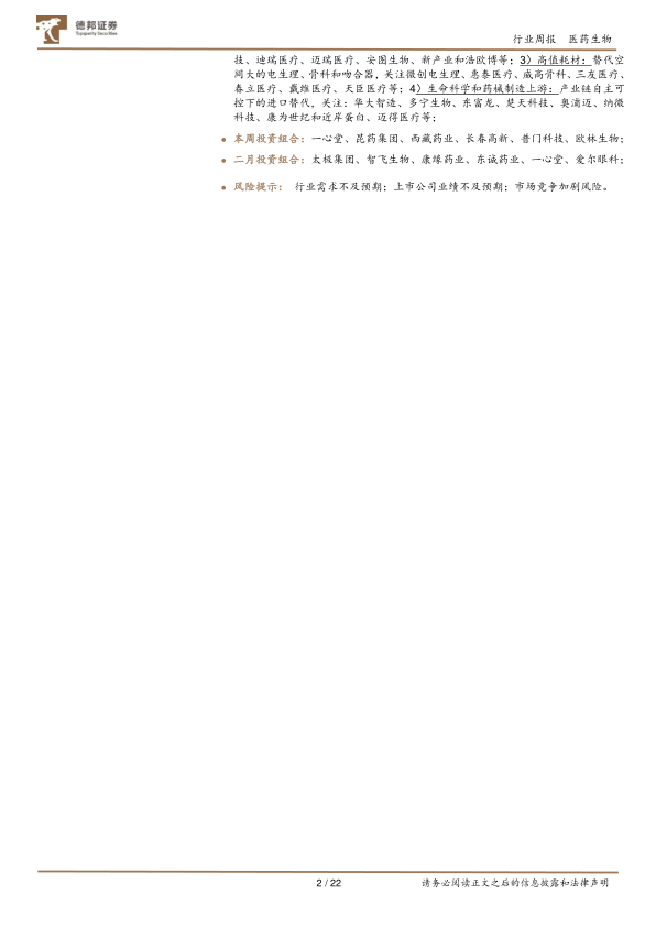本周投资组合推荐一心堂、昆药集团、西藏药业、长春高新、普门科技、欧林生物。二月投资组合推荐太极集团、智飞生物、康缘药业、东诚药业、一心堂、爱尔眼科。