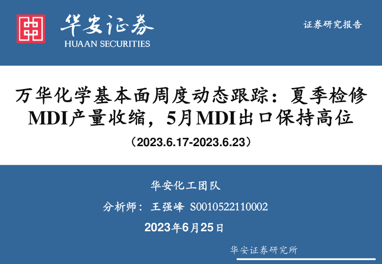 万华化学基本面周度动态跟踪:夏季检修MDI产量收缩,5月MDI出口保持高位