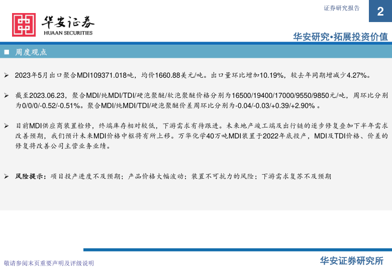 本报告核心观点指出,当前MDI市场受夏季检修影响,产量有所收缩,但5月份聚合MDI出口量保持高位,达到109371.018吨,环比增长10.19%。尽管下游需求有待进一步跟进,但供应商装置检修导致终端库存相对较低。展望未来,随着地产竣工端及出行链的逐步修复,叠加下半年需求改善预期,预计MDI价格中枢将有所上移。万华化学40万吨MDI装置于2022年底投产,MDI及TDI价格和价差的修复将直接改善公司主营业务业绩。