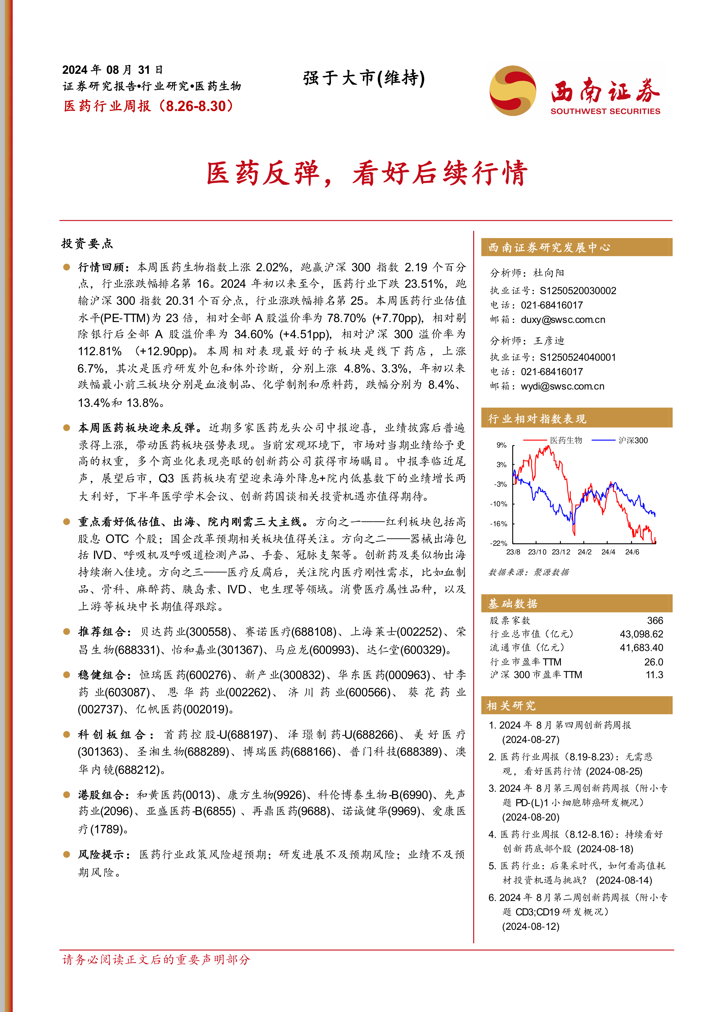 稳健组合:恒瑞医药(600276)、新产业(300832)、华东医药(000963)、甘李药业(603087)、恩华药业(002262)、济川药业(600566)、葵花药业(002737)、亿帆医药(002019)。