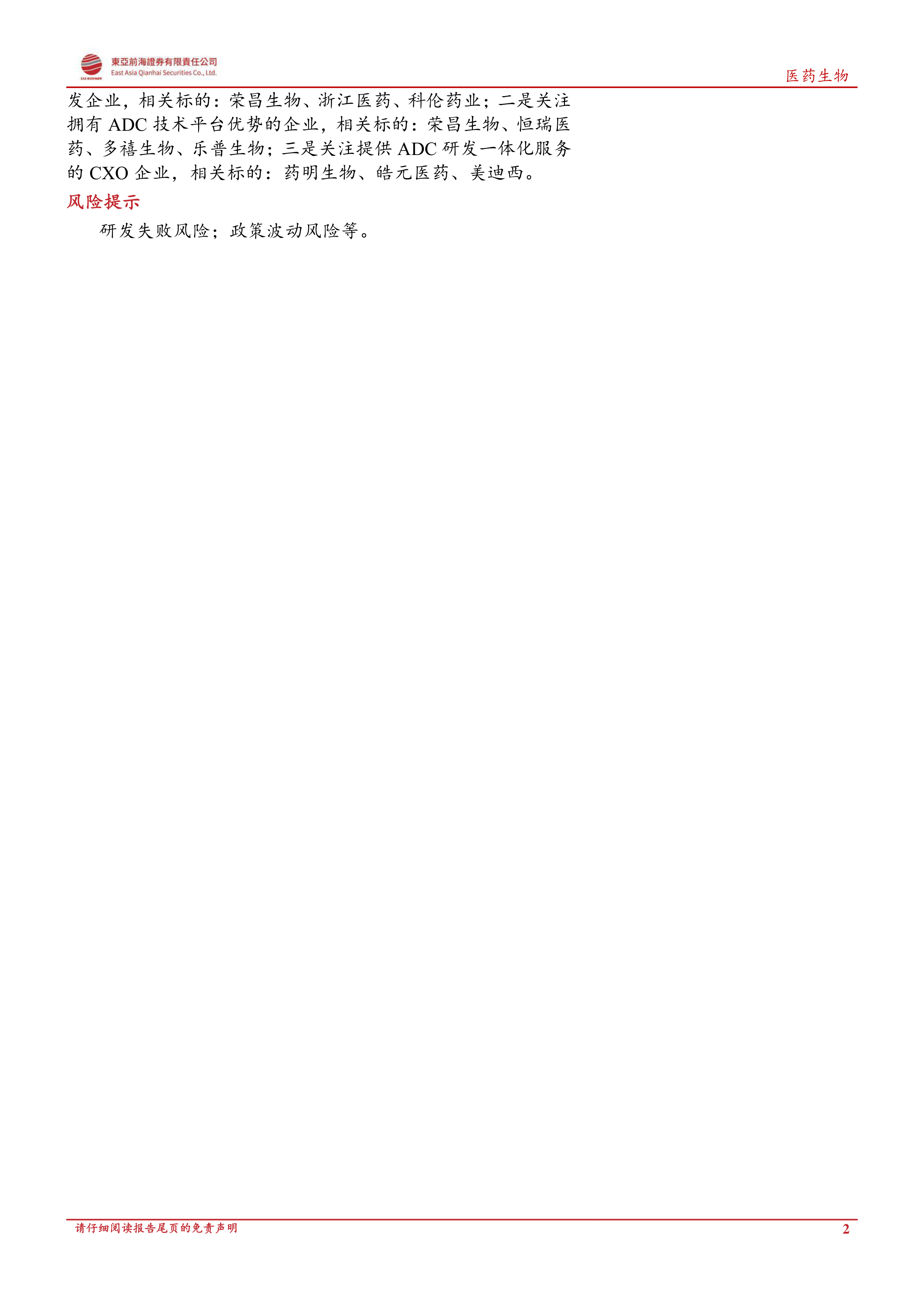 ADC药物引领了国内第二波创新药浪潮,目前是创新药领域最为火热的赛道。我们建议关注三类ADC药物相关企业:一是关注靶点、适应症差异化布局,研发进度领先的ADC药物开发企业,相关标的:荣昌生物、浙江医药、科伦药业;二是关注拥有ADC技术平台优势的企业,相关标的:荣昌生物、恒瑞医药、多禧生物、乐普生物;三是关注提供ADC研发一体化服务的CXO企业,相关标的:药明生物、皓元医药、美迪西。