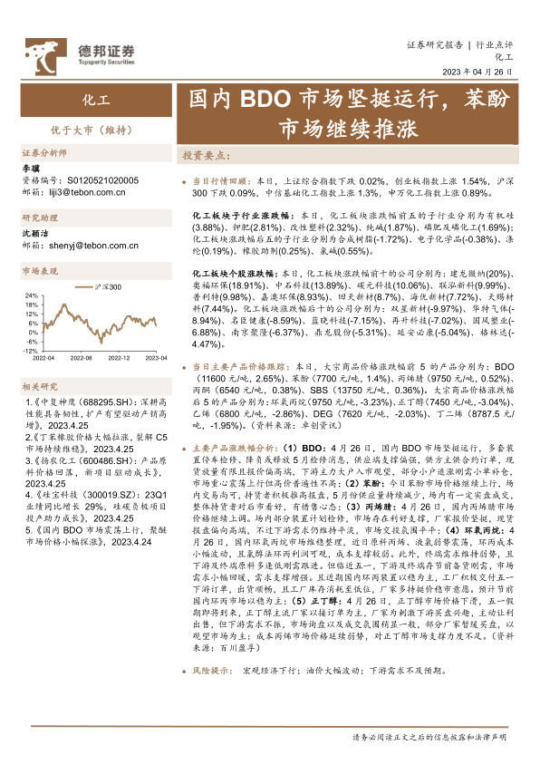 2023年4月26日,化工市场呈现结构性分化,BDO和苯酚因供应紧张和持货者惜售心态而表现强势,价格持续上涨。丙烯腈受检修利好支撑价格上调,而环氧丙烷在成本弱势和节前备货需求之间寻求平衡,正丁醇则因下游需求不振和成本支撑不足而价格下滑。整体化工板块表现优于大盘,但子行业和个股间差异显著。投资者需密切关注宏观经济走势、国际油价波动以及下游需求变化带来的潜在风险。