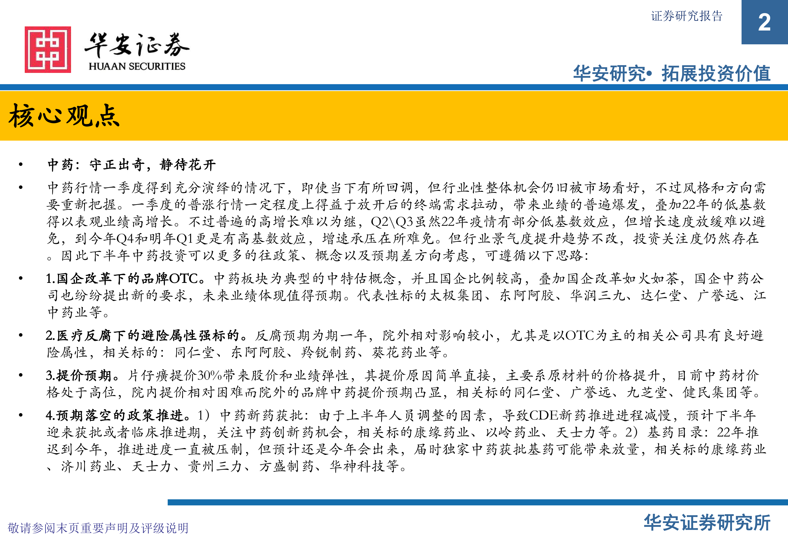 4.预期落空的政策推进。 1) 中药新药获批: 由于上半年人员调整的因素, 导致CDE新药推进进程减慢, 预计下半年迎来获批或者临床推进期, 关注中药创新药机会, 相关标的康缘药业、 以岭药业、 天士力等。 2) 基药目录: 22年推迟到今年, 推进进度一直被压制, 但预计还是今年会出来, 届时独家中药获批基药可能带来放量, 相关标的康缘药业、 济川药业、 天士力、 贵州三力、 方盛制药、 华神科技等