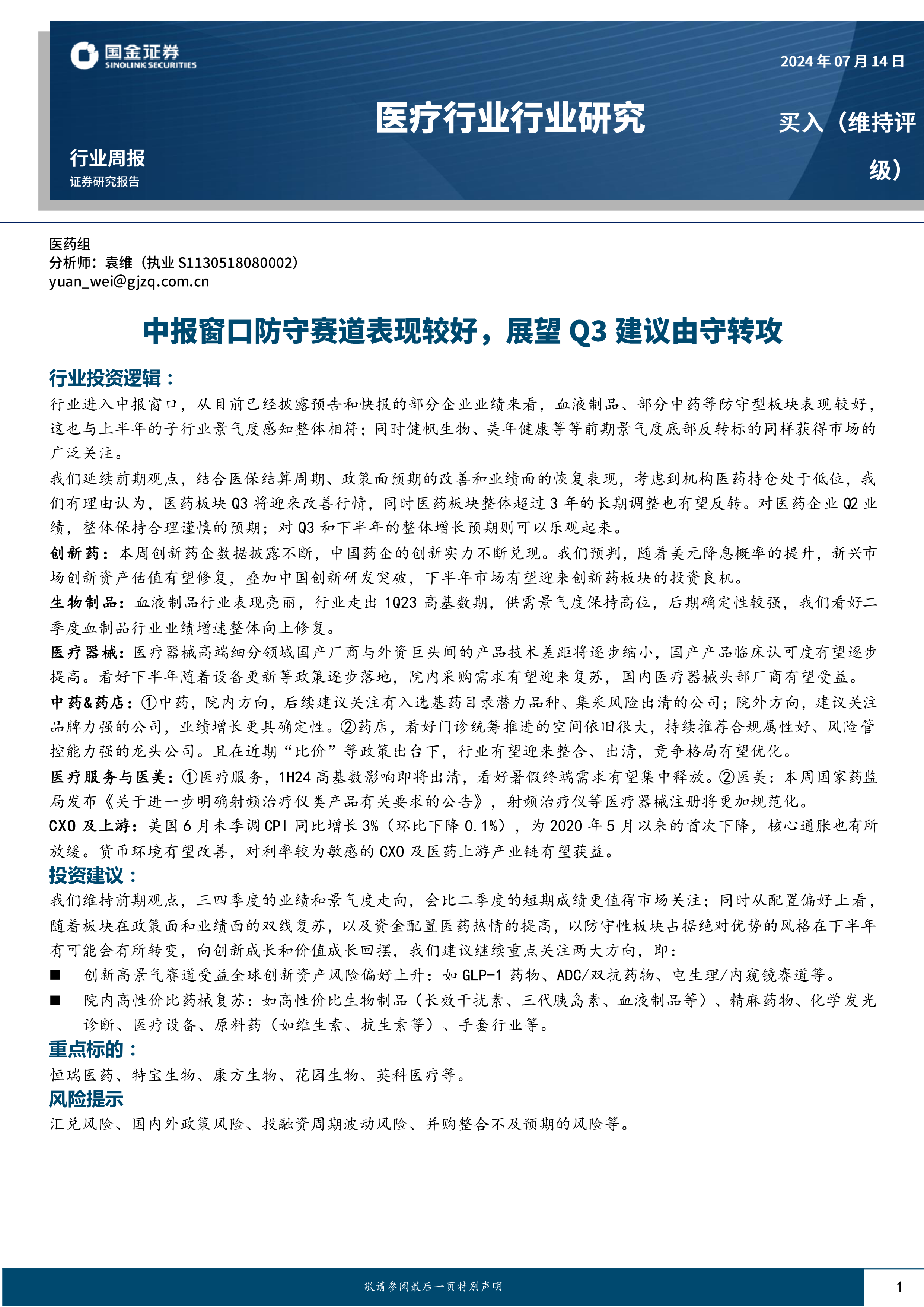 医疗行业行业研究:中报窗口防守赛道表现较好,展望Q3建议由守转攻