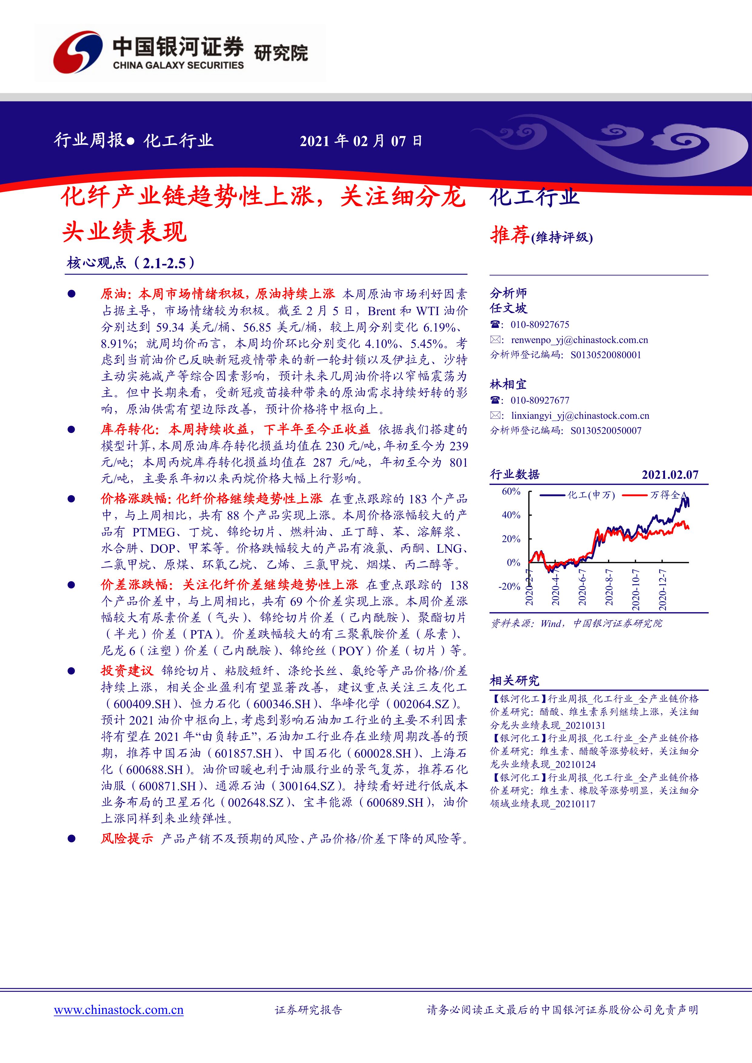 投资建议 锦纶切片、粘胶短纤、涤纶长丝、氨纶等产品价格/价差持续上涨,相关企业盈利有望显著改善,建议重点关注三友化工(600409.SH)、 恒力石化(600346.SH)、 华峰化学(002064.SZ)。预计 2021 油价中枢向上,考虑到影响石油加工行业的主要不利因素将有望在 2021 年“由负转正”,石油加工行业存在业绩周期改善的预期,推荐中国石油(601857.SH)、中国石化(600028.SH)、上海石化(600688.SH)。油价回暖也利于油服行业的景气复苏,推荐石化油服(600871.SH)、通源石油(300164.SZ)。 持续看好进行低成本业务布局的卫星石化(002648.SZ)、宝丰能源(600689.SH),油价上涨同样到来业绩弹性。