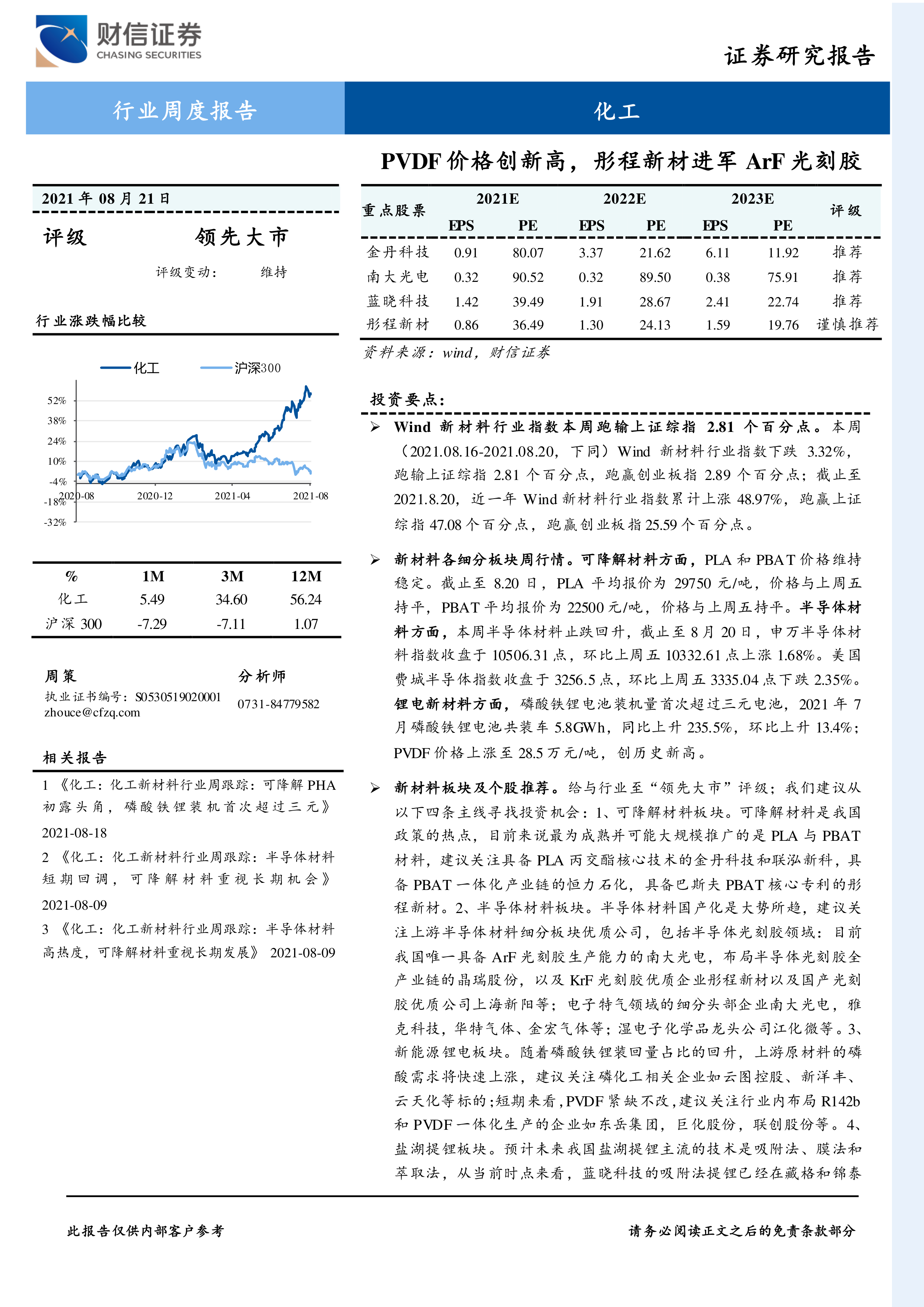 新材料板块及个股推荐。给与行业至“领先大市”评级;我们建议从以下四条主线寻找投资机会:1、可降解材料板块。可降解材料是我国政策的热点,目前来说最为成熟并可能大规模推广的是PLA与PBAT材料,建议关注具备PLA丙交酯核心技术的金丹科技和联泓新科,具备PBAT一体化产业链的恒力石化,具备巴斯夫PBAT核心专利的彤程新材。2、半导体材料板块。半导体材料国产化是大势所趋,建议关注上游半导体材料细分板块优质公司,包括半导体光刻胶领域:目前我国唯一具备ArF光刻胶生产能力的南大光电,布局半导体光刻胶全产业链的晶瑞股份,以及KrF光刻胶优质企业彤程新材以及国产光刻胶优质公司上海新阳等;电子特气领域的细分头部企业南大光电,雅克科技,华特气体、金宏气体等;湿电子化学品龙头公司江化微等。3、新能源锂电板块。随着磷酸铁锂装回量占比的回升,上游原材料的磷酸需求将快速上涨,建议关注磷化工相关企业如云图控股、新洋丰、云天化等标的;短期来看,PVDF紧缺不改,建议关注行业内布局R142b和PVDF一体化生产的企业如东岳集团,巨化股份,联创股份等。4、盐湖提锂板块。预计未来我国盐湖提锂主流的技术是吸附法、膜法和萃取法,从当前时点来看,蓝晓科技的吸附法提锂已经在藏格和锦泰中运用且效果较好,重点推荐蓝晓科技。同时,建议关注膜法标的久吾高科和三达膜,萃取法标的新化股份。
