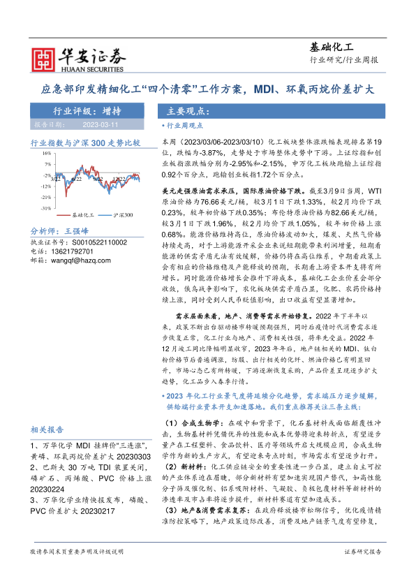 基础化工行业周报:应急部印发精细化工“四个清零”工作方案,MDI、环氧丙烷价差扩大