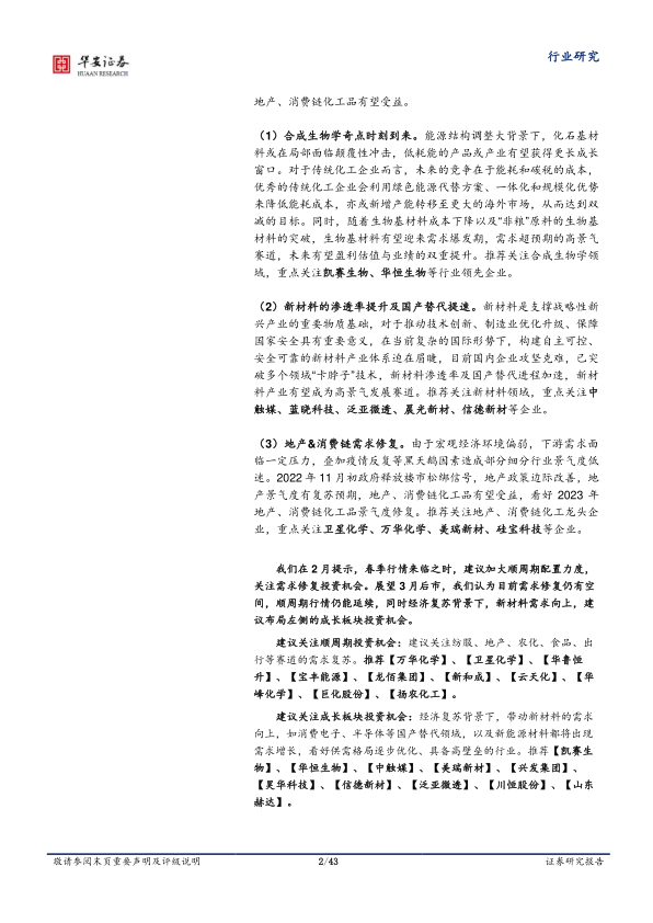 (3)地产&消费链需求修复。由于宏观经济环境偏弱,下游需求面临一定压力,叠加疫情反复等黑天鹅因素造成部分细分行业景气度低迷。2022年11月初政府释放楼市松绑信号,地产政策边际改善,地产景气度有复苏预期,地产、消费链化工品有望受益,看好2023年地产、消费链化工品景气度修复。推荐关注地产、消费链化工龙头企业,重点关注卫星化学、万华化学、美瑞新材、硅宝科技等企业。我们在2月提示,春季行情来临之时,建议加大顺周期配置力度,关注需求修复投资机会。展望3月后市,我们认为目前需求修复仍有空间,顺周期行情仍能延续,同时经济复苏背景下,新材料需求向上,建议布局左侧的成长板块投资机会。