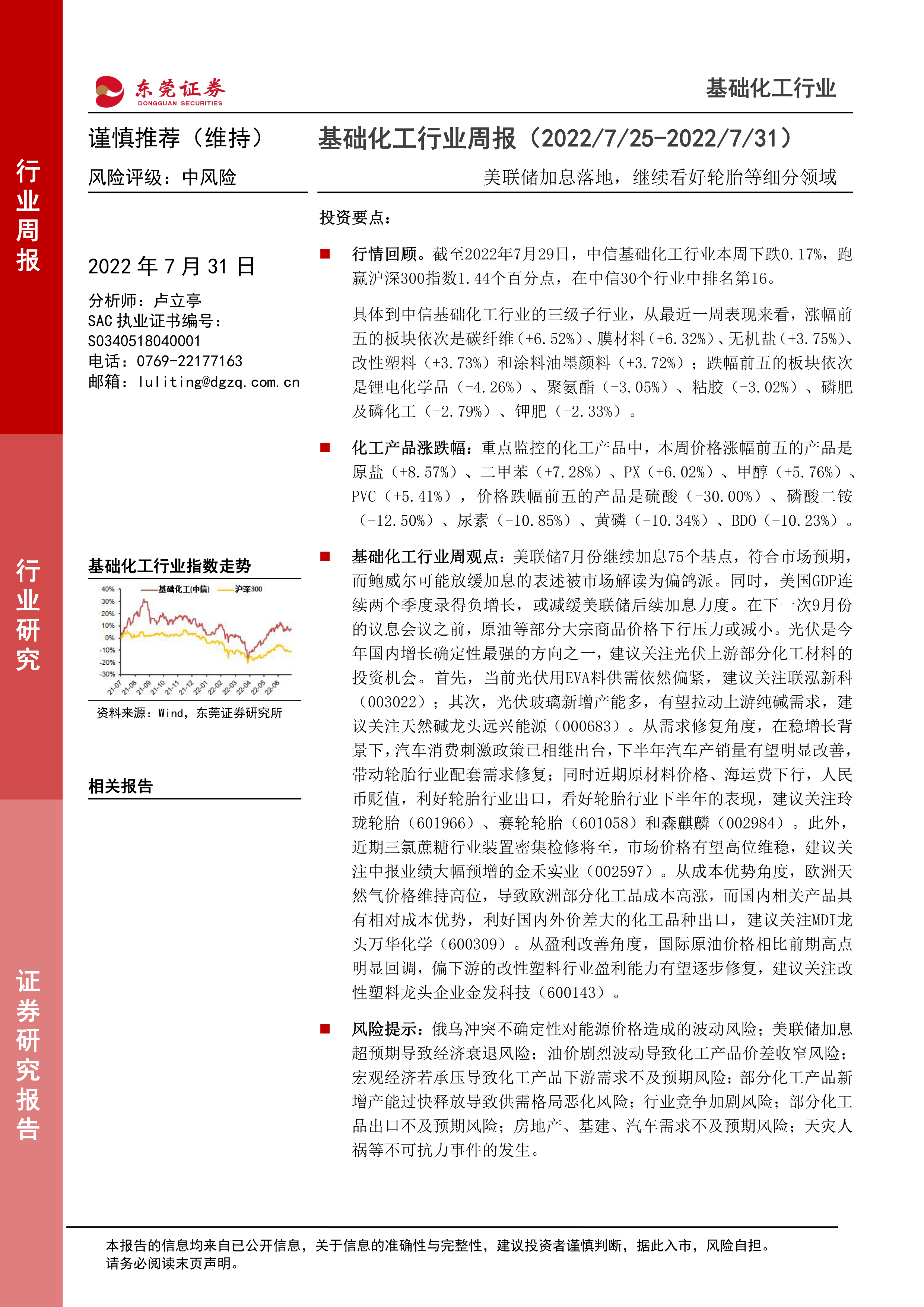 本周(2022/7/25-2022/7/31)基础化工行业整体表现稳健,跑赢沪深300指数,但内部子行业和产品价格呈现分化。碳纤维、膜材料等板块涨幅居前,而锂电化学品、聚氨酯等有所回调。化工产品价格涨跌互现,原盐、二甲苯等上涨,硫酸、磷酸二铵等下跌。宏观层面,美联储加息落地但可能放缓的预期,以及美国GDP连续负增长,为大宗商品价格带来稳定预期。国内稳增长政策,特别是汽车消费刺激,为相关化工下游需求修复提供了动力。报告建议投资者关注光伏上游材料、受益于需求修复的轮胎行业、三氯蔗糖、具备成本优势的MDI以及盈利改善的改性塑料等细分领域的投资机会。同时,需警惕俄乌冲突、美联储加息、油价波动及宏观经济下行等多种风险因素对行业可能造成的影响。