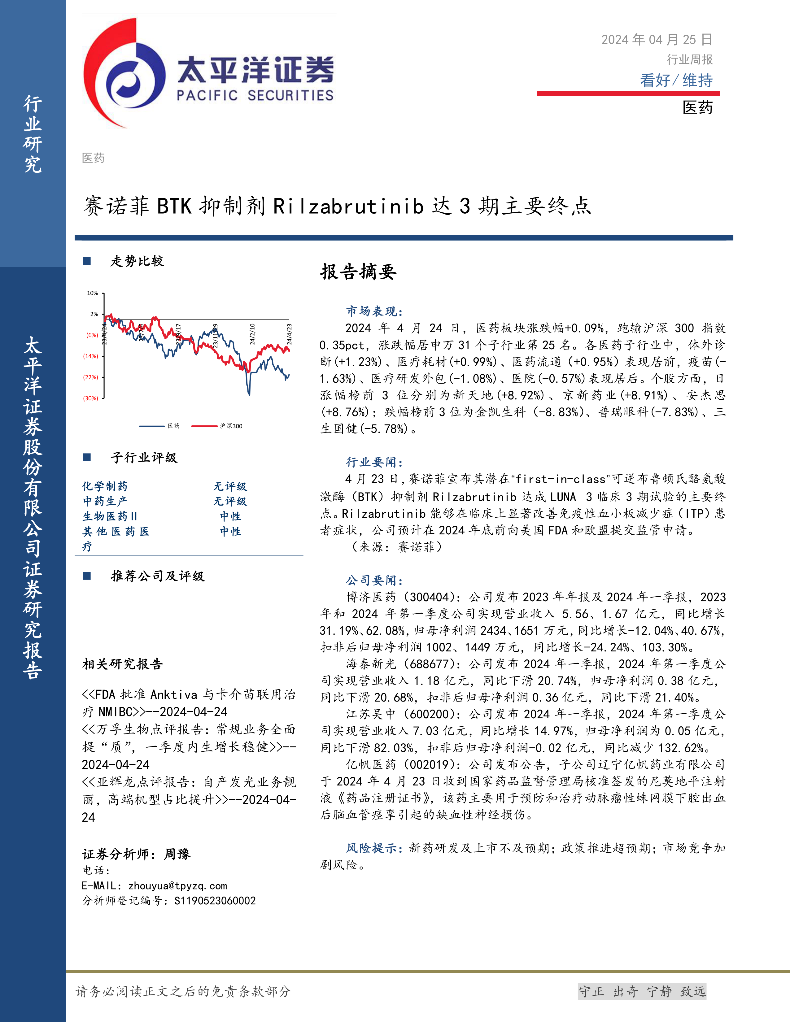 赛诺菲BTK抑制剂Rilzabrutinib的积极临床结果,以及博济医药、海泰新光、江苏吴中、亿帆医药等公司的业绩报告和产品进展,反映了医药行业的创新和发展动态,值得投资者关注。
