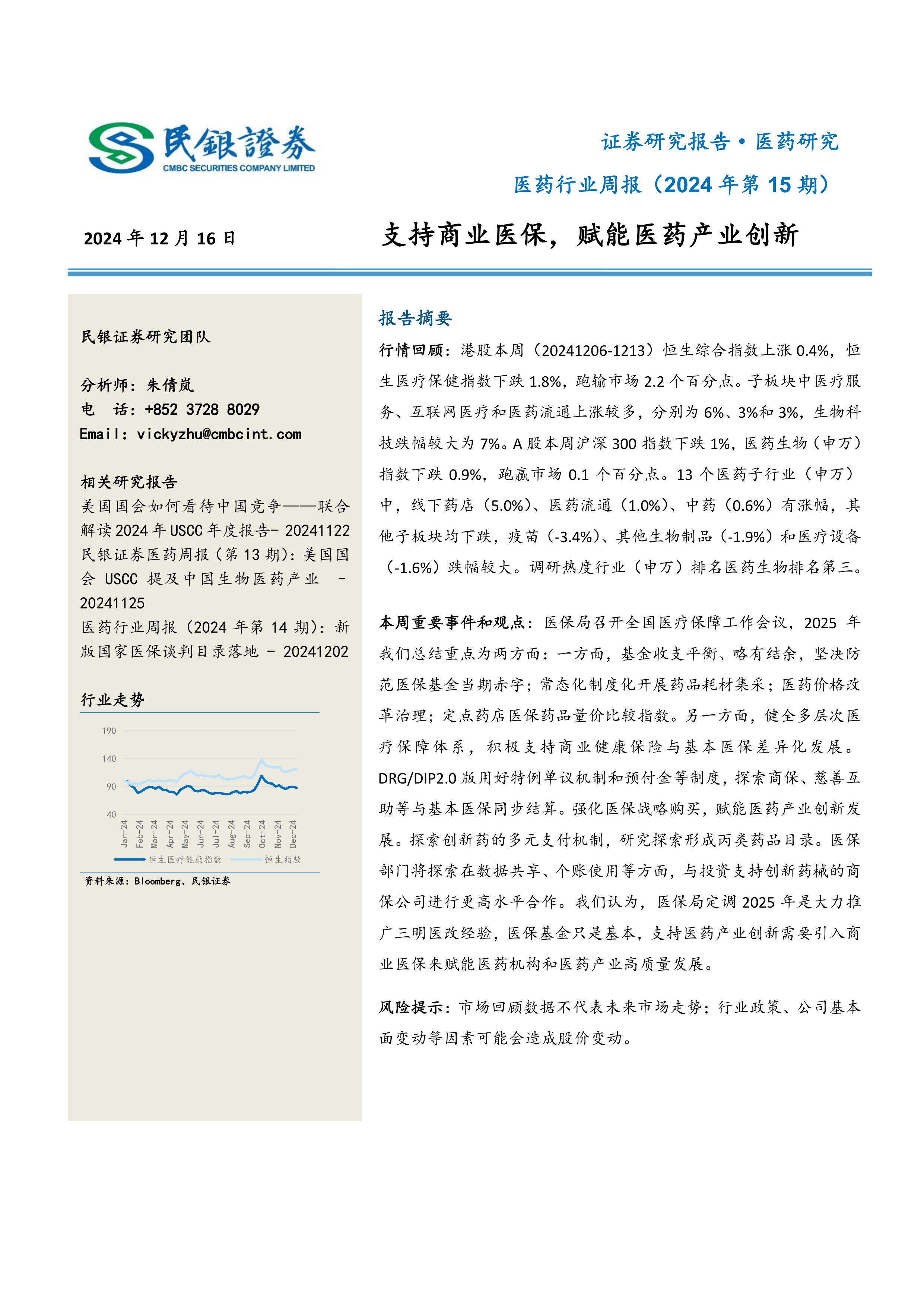 本周重要事件和观点:医保局召开全国医疗保障工作会议,2025年我们总结重点为两方面:一方面,基金收支平衡、略有结余,坚决防范医保基金当期赤字;常态化制度化开展药品耗材集采;医药价格改革治理;定点药店医保药品量价比较指数。另一方面,健全多层次医疗保障体系,积极支持商业健康保险与基本医保差异化发展。DRG/DIP2.0版用好特例单议机制和预付金等制度,探索商保、慈善互助等与基本医保同步结算。强化医保战略购买,赋能医药产业创新发展。探索创新药的多元支付机制,研究探索形成丙类药品目录。医保部门将探索在数据共享、个账使用等方面,与投资支持创新药械的商保公司进行更高水平合作。我们认为,医保局定调2025年是大力推广三明医改经验,医保基金只是基本,支持医药产业创新需要引入商业医保来赋能医药机构和医药产业高质量发展。