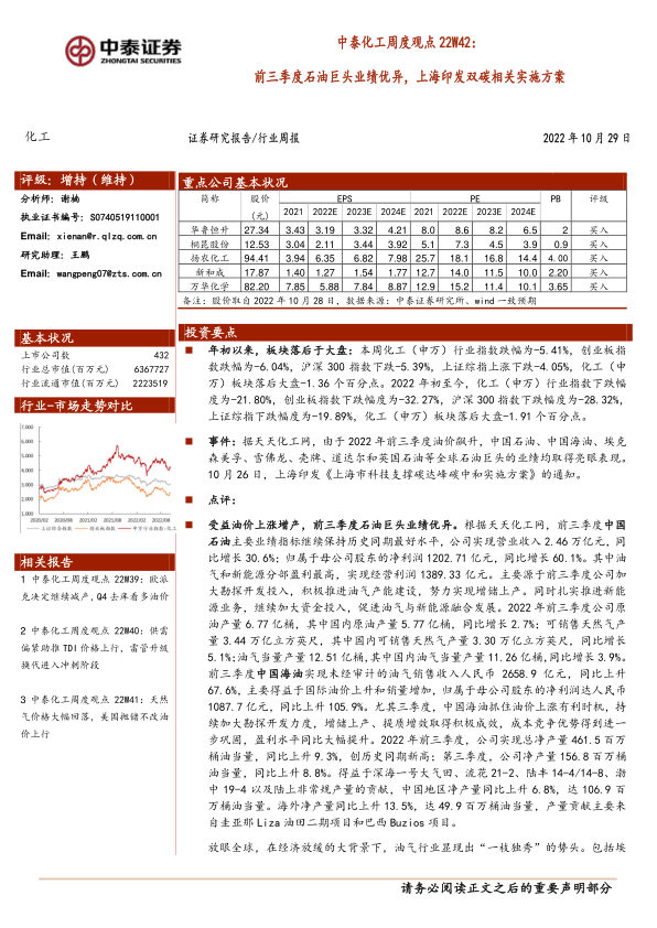 中泰化工周度观点22W42:前三季度石油巨头业绩优异,上海印发双碳相关实施方案