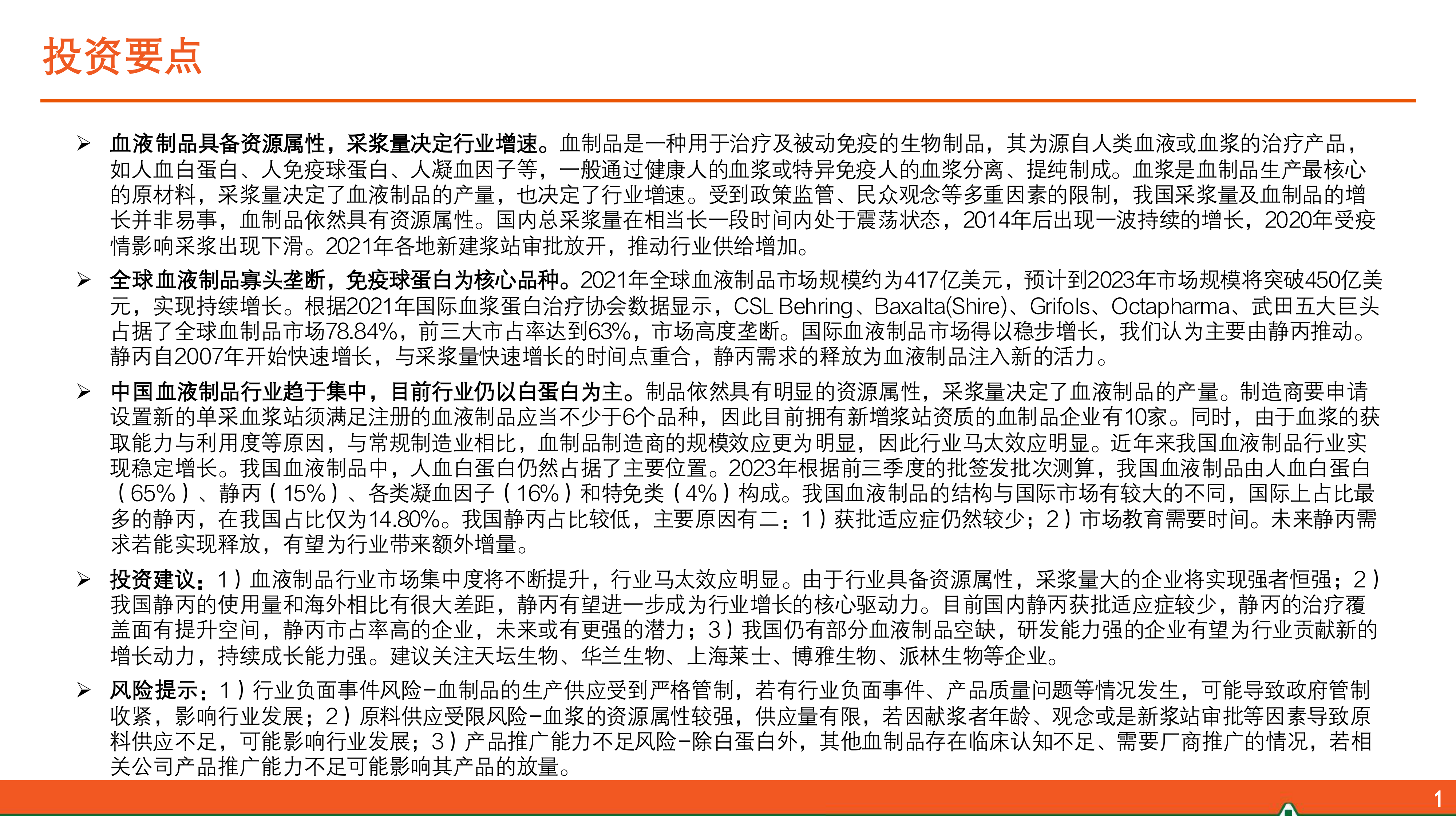 风险提示:1)行业负面事件风险-血制品的生产供应受到严格管制,若有行业负面事件、产品质量问题等情况发生,可能导致政府管制收紧,影响行业发展;2)原料供应受限风险-血浆的资源属性较强,供应量有限,若因献浆者年龄、观念或是新浆站审批等因素导致原料供应不足,可能影响行业发展;3)产品推广能力不足风险-除白蛋白外,其他血制品存在临床认知不足、需要厂商推广的情况,若相关公司产品推广能力不足可能影响其产品的放量。