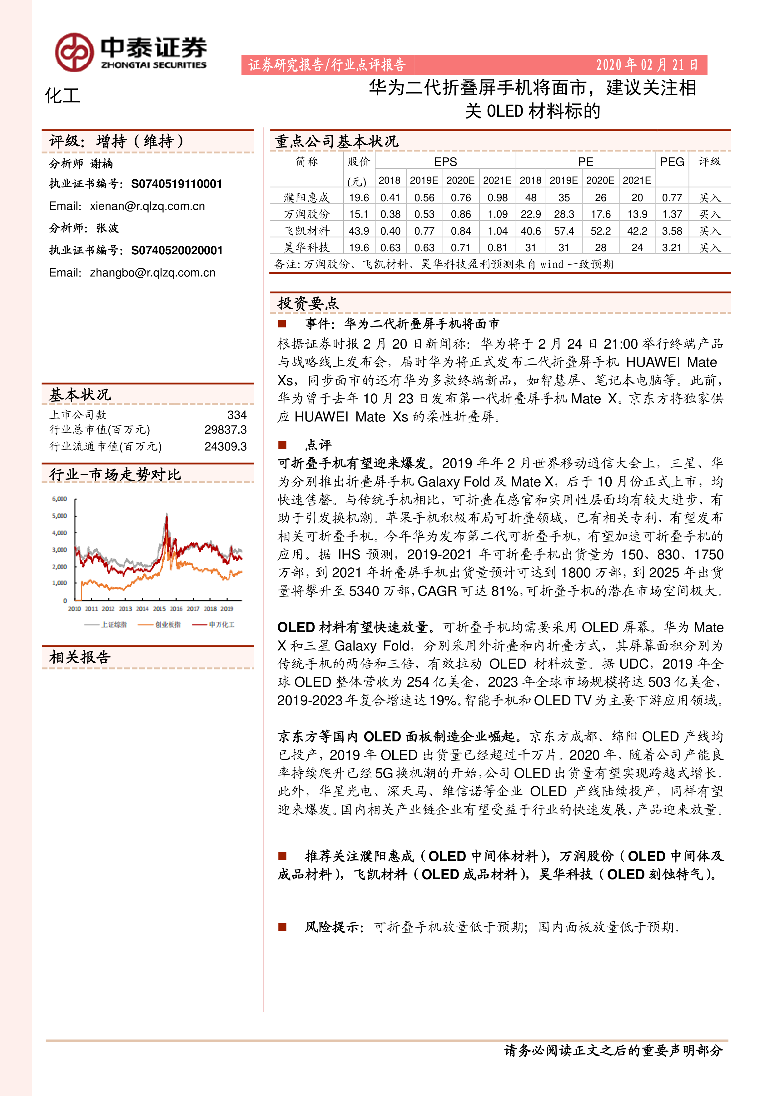 本报告分析了华为二代折叠屏手机发布对市场的影响,认为可折叠手机市场潜力巨大,OLED材料需求将快速增长。建议投资者关注OLED材料相关标的,但需注意可折叠手机和国内面板放量低于预期的风险。