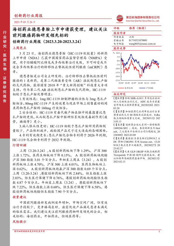 创新药行业周报:海创药业德恩鲁胺上市申请获受理,建议关注前列腺癌药物研发领先标的